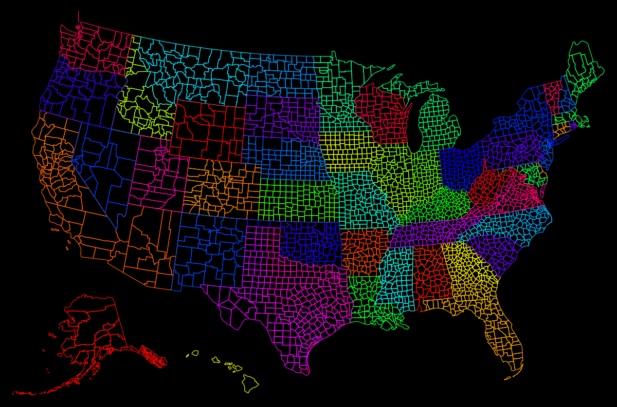 We took the publicly available polygon data of the 3141 US counties, threw them into