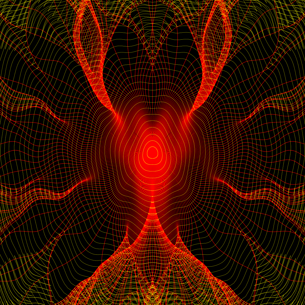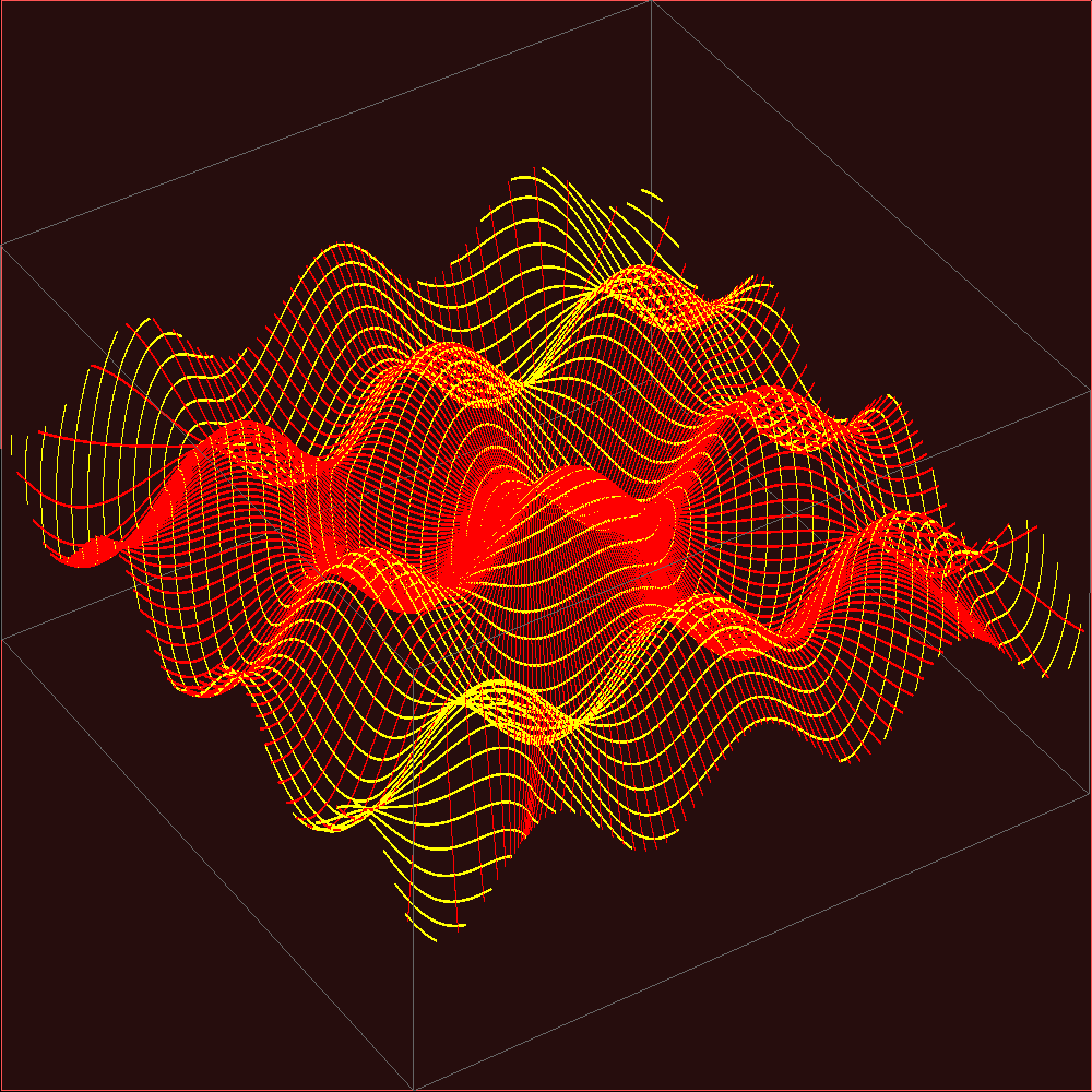 ![]() Geodesic spray starting at a point. We see the geodesics and the wave fronts. This is the flow starting at (0,0) on the graph of the function f(x,y) = 0.6( cos(2 x) - Sin[y-0.1)). |