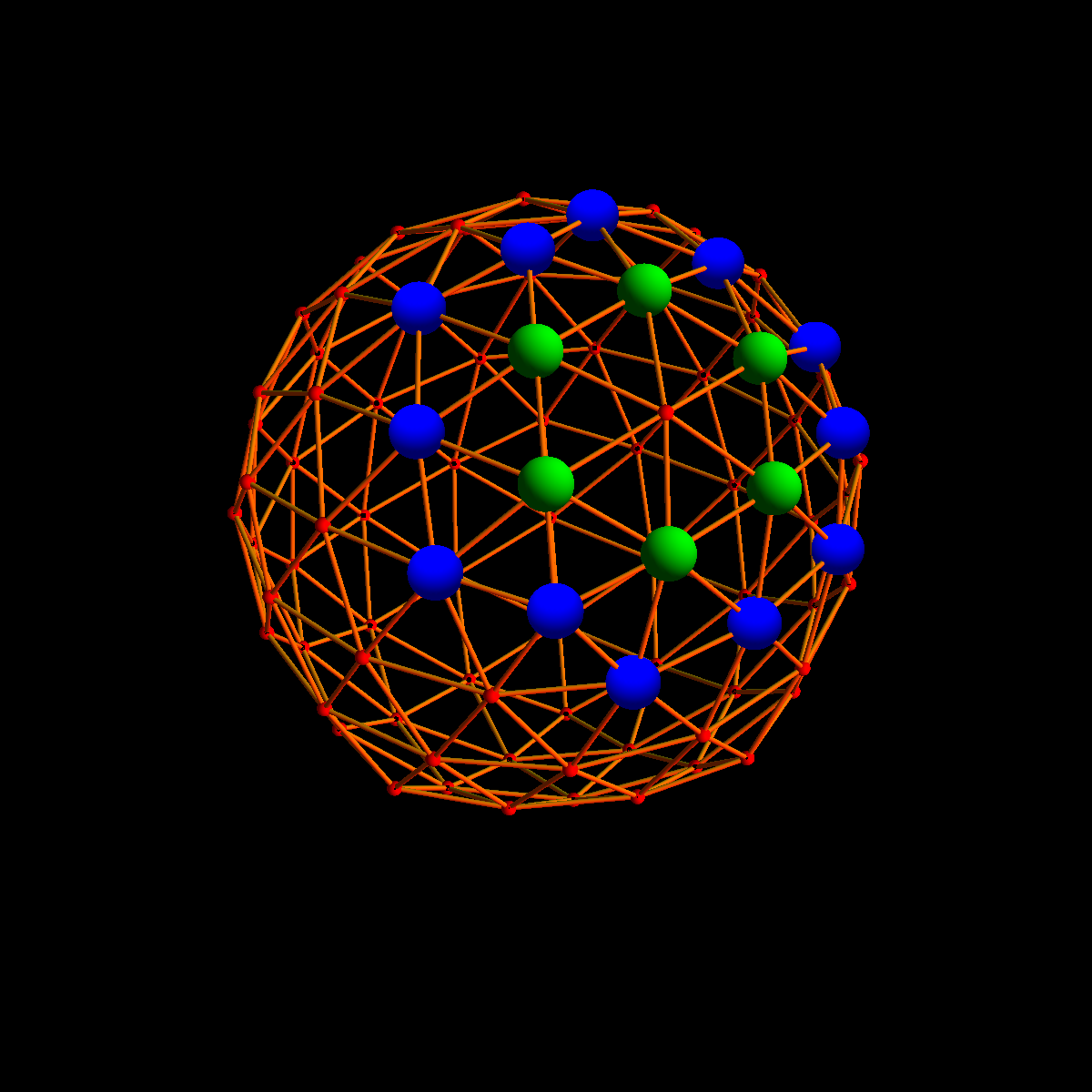 Here is an example for which the total curvature K(x) = 2 |S1| - |S2| is equal to 60. Like for the icosahedron, where each point has curvature 5 and 12*5=60, the curvature 60 theorem holds for all fullerene or two dimensional graphs for which the degree is 5 or 6. Since most graphs I had build with geomags had curvature 60, I had hoped in Spring 2009 that a curvature 60 would hold. 2 years later, I still do not know exact conditions which make a curvature 60 theorem work. A two dimensional SMOOTH graph has curvature 60. What is condition SMOOTH My paper on flat regions shows that it might be subtle. We certainly need that spheres S1(p) and S2(p) are cyclic one dimensional graphs at each point. Its easy to see that this implies that each point has degree larger than 4. I know that XXX= "the combinatorial curvatures K1(p) = 6-|S1(p)|" are all nonnegative" works but this is rather weak because such graphs are either flat tori with zero curvature or then the Euler characteristic is 2. (By the combinatorial Gauss Bonnet, the sum of the combinatorial curvatures is 6 times the Euler characteristic so that for Euler characteristic is negative, there are points with negative curvature).