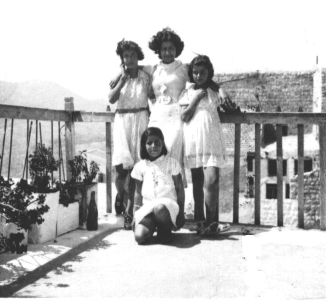 Added April 2025: in Safad, around 1937: "4 sisters": on knee: Simcha, Sushi (left), Rebecca (middle) and Margalit (right)