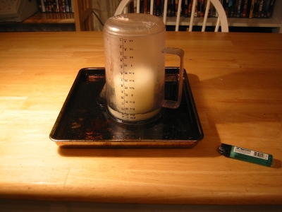 After cooling, the plastic wrap collapses. Peter Dureen again: The second experiment is a parallel one to the candle experiment. I and an associate made a little stand from aluminum foil, so that it could support a piece of burning charcoal. This little stand basically replaces the candle in the burning candle experiment. We had a shallow reservoir of water in a pan, the water surrounding the little stand. I took a piece of charcoal, which I had fetched earlier from my fireplace, and took a propane torch to all sides of it to ensure it was well lit, and then placed it on the stand. My accomplice then quickly placed a jar over the assembly. Remarkably, water eventually rose in the jar after the apparatus had a chance to cool down. It, in fact rose to precisely the same level as it had in a candle experiment using the same jar. So it seems that charcoal has the same effect as a candle. Now in your analysis, you mention that the candle burns hydrogen, and produces water, and that seemed quite reasonable to me at the time. But after conducting this experiment, I must ask why burning carbon alone should produce precisely the same result. It is hard for me to explain to my students these two experiments. I now await further discussion of this matter, and hopefully, an analysis that explains the results of these recent experiments.I think this is more indication that some hot air has left the container before it started to cool down. I have repeated the experiments also with different type of containers and seen also some air, as other teachers have observed too. I thank you for posting your explanation. I hope the above adds something to the discussion. Maybe we should consult Faraday. Did he not write something called the history of the candle?Faraday had been a fantastic experimenter and assisted as a chemist before for a long time. Lavoisier was definitely a great pioneer in this context. |
