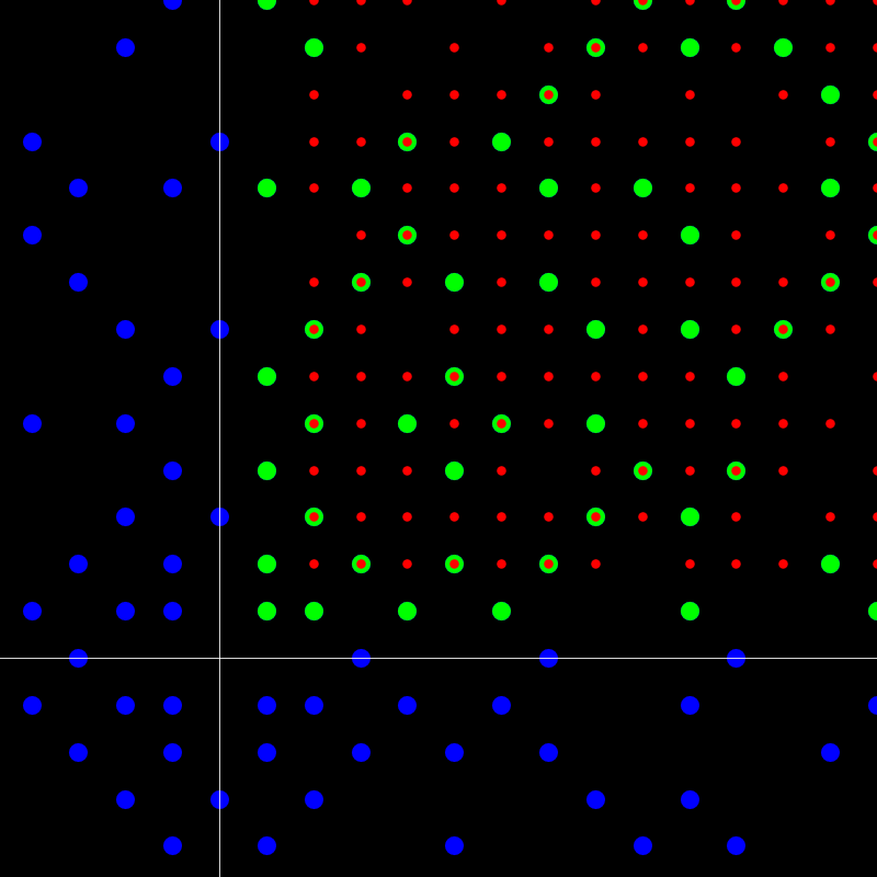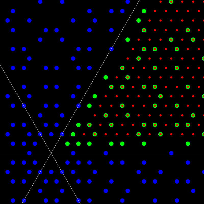 primes with a ≥ 0,b ≥ 0. [There is a weak but elegant Eisenstein Goldbach conjecture stating that every Eisenstein integer is a sum of two Eisenstein primes. It pairs with a weak Gaussian Goldbach conjecture stating that every even Gaussian integer is a sum of two Gaussian primes. The weak Gaussian version is due to Holben and Jordan from 1968.] In the picture to the left, we see the primes in blue or green. The green ones are the ones of the form a+b w with a>0,b>0. The claim is that every red integer is the sum of two green primes. In the picture to the right, we see the analogue Gaussian case. There, we can only reach all even Gaussian integers in the padded quadrant.