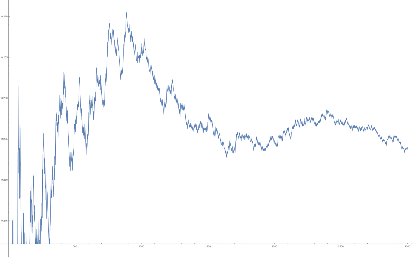 x1= 0.141, x2= 0.592 , x3=0.653 etcNow, we can integrate a function like f(x)=x3 numerically by building the sum (∑k=120 (xk)^3)/20. In this case the sum is 0.2338 which is still a bit off from the 0.25 we want to have. But when using more digits this converges. For 600 digits, we get 0.244244, with 1000 digits we get 0.25467. Here is what we get depending on the number of digits. The k'th entry in this block uses 3k digits of π so that we have k numbers xk.