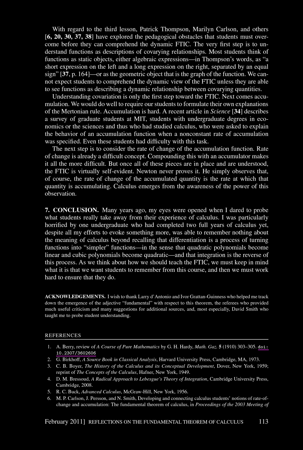 Patrick Thompson, Marilyn Carlson, and others have explored the pedagogical obstacles that students must overcome before they can comprehend the dynamic FTIC. The very first step is to understand functions as descriptions of covarying relationships. Most students think of functions as static objects, either algebraic expressions--in Thompson's words, as "a short expression on the left and a long expression on the right, separated by an equal sign" --or as the geometric object that is the graph of the function. We can not expect students to comprehend the dynamic view of the FTIC unless they are able to see functions as describing a dynamic relationship between covarying quantities. Understanding covariation is only the first step toward the FTIC. Next comes accumulation. We would do well to require our students to formulate their own explanations of the Mertonian rule. Accumulation is hard. A recent article in Science describes a survey of graduate students at MIT, students with undergraduate degrees in economics or the sciences and thus who had studied calculus, who were asked to explain the behavior of an accumulation function when a nonconstant rate of accumulation was specified. Even these students had difficulty with this task. The next step is to consider the rate of change of the accumulation function. Rate of change is already a difficult concept. Compounding this with an accumulator makes it all the more difficult. But once all of these pieces are in place and are understood, the FTIC is virtually self-evident. Newton never proves it. He simply observes that, of course, the rate of change of the accumulated quantity is the rate at which that quantity is accumulating. Calculus emerges from the awareness of the power of this observation.