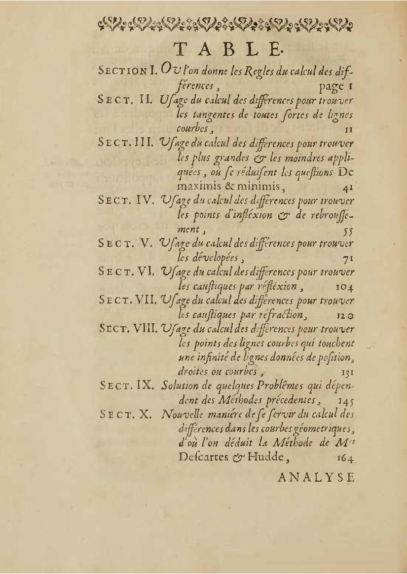 Analyse des infiniment petits, pour l'intelligence des lignes courbes Par Mr le Marquis de L'Hospital. L'analyse qu'on explique dans cet ouvrage, suppose la commune; mais elle en effort differente. L'analyse ordinaire ne traite que des grandeurs finies : celle-ci penetre jusque dans l'infini meme. Elle compare les differences infiniment petites des grandeurs finies; uelle decouvre les rapports de ces differences et par la elle fait connoitre ceux des grandeurs finies, qui comparers avec ccs infinimeurs petits font comme aucanc d'infinis. On peut meme dire que dire que cette Analyse s'etend au-dela de l'infini: car elle ne se borne pas aux differences infiniment pecites ; mais elle decouvre les rapporcts des differences de ces differences, ceux encore des differences troisiemes, quatriemes et ainsi de suite, sans trouver jamais de terme qui qui puisse arreter. De forte qu elle n'embrasse pas seulement l'infini; mais l'infini de l'infini, ou donc infinite d'infinis. PDF (I removed some empty pages from the source). |