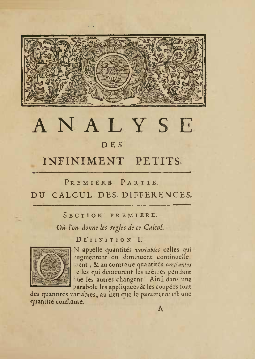 L'Hopitals textbook first appeared anonymously since l'Hopital got much of the material from Johann Bernoulli. It is believed that l'Hopitals rule is actually by Bernoulli. L'Hopitals textook is considered the first calculus textook. Here is the first paragraph cleaned out (the OCR'd text available at this source is very rough)