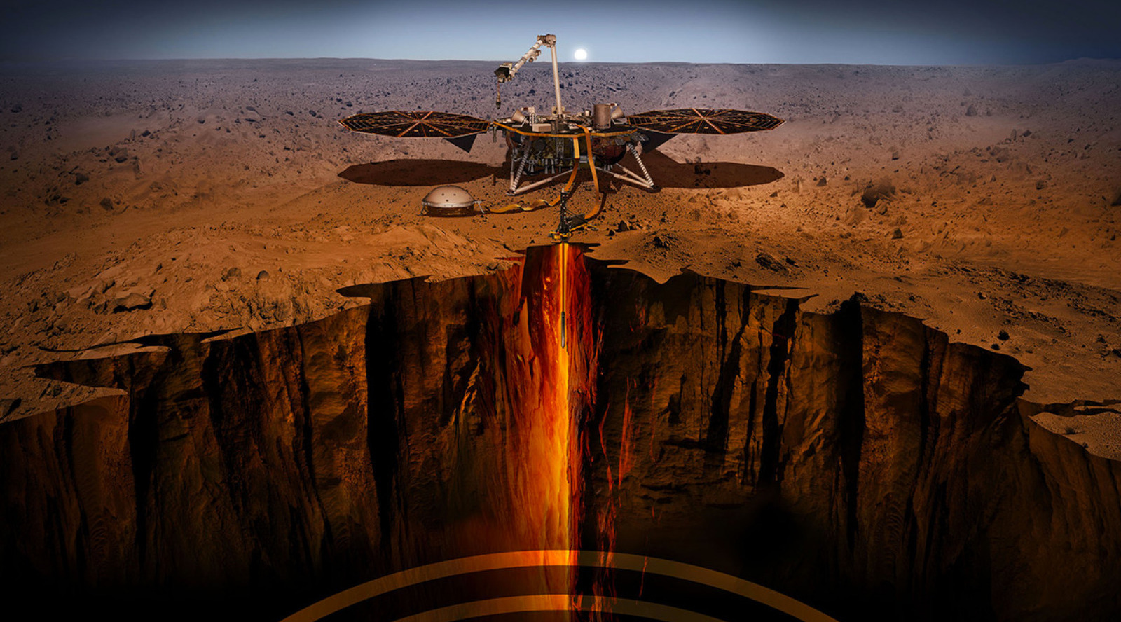 Exciting time on Mars. Insight has successfully landed on Mars and hopefully will soon start digging. We have computed in the divergence lecture, how the gravity inside a body changes. Insight will however only drill a few meters. The following pictures are mostly from NASA, distributed on many other sites like popular mechanics, discovery channel. Search for more pictures. There are also various animations and slides on Youtube like these: