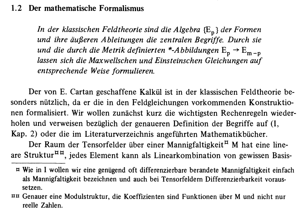 A great textbook in mathematical physics is the series of Thirring. I liked as a student especially the great summaries for each chapter (but I found the book very hard to digest). In any way, there is one great page in the second volume, which shows the evolution of the Maxwell equations. Obviously, we have learned to make things more elegant since Maxwell discovered the equations. I have only the German edition, but there is an English translation. Here is an example of such a section summary. We translate that summary:| In classical field theories, the algebra Ep of forms and their exterior derivatives play a central role. Through them as well as through the *-map Ep -> Em-p one can write down the Maxwell and Einstein equations. |