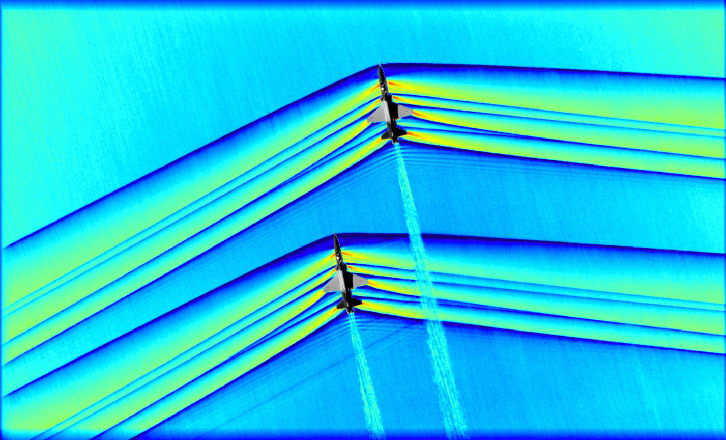NASA captures showed some images of colliding shock waves from T-38 jets flying in formation at supersonic speeds: This is partial differential equations in action. NASA used the Schlieren photography technique to capture these interacting shockwaves.