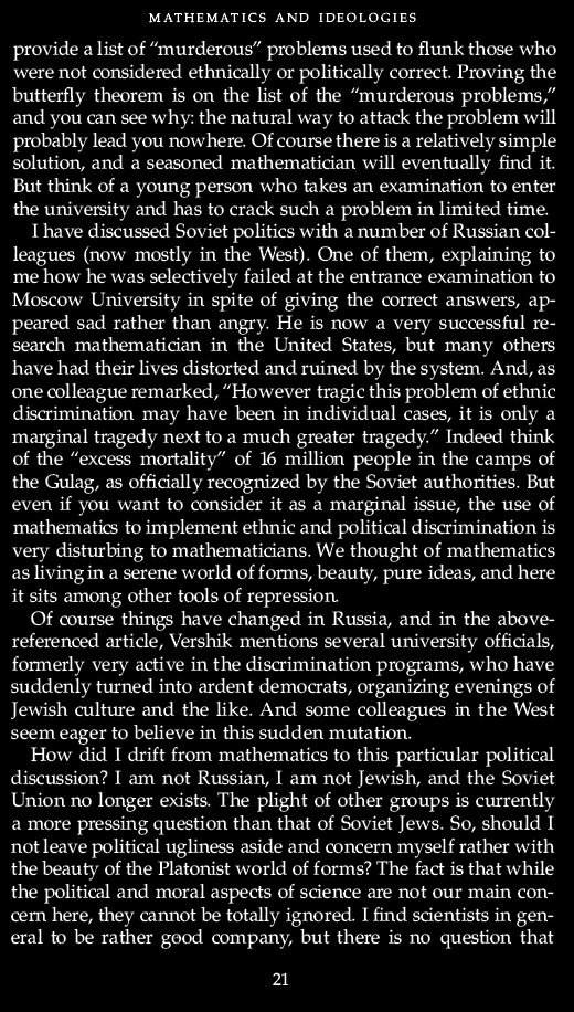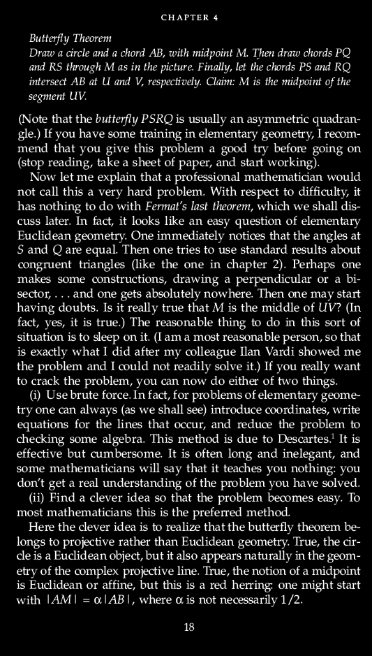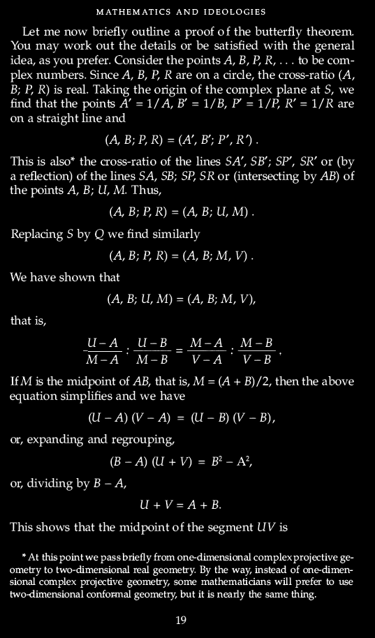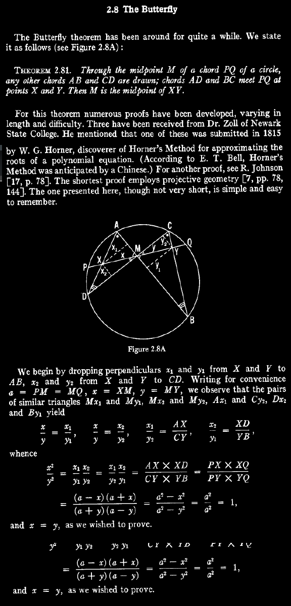 history. The background music to the animation to the left is from Celtic Harp Volume IV, "O'Carolan's Dream, The Butterfly". The following pages are from the book by Ruelle. It is an interesting story since the theorem is an example of a "murdorous problems". Ruelle outlines also the proof of the theorem. Proofs are difficult to find. And it needs some knowledge in complex analysis, in particular that Moebius transformations preserve the cross ratio. Below is a proof found in Coxeter-Greitzer. We will look at this theorem in the lecture, but focus on an other aspect of it. When I was a astudent at ETH, I have had Ruelle as a professor in a "Nachdimplom Vorlesung" (=graduate course) on zeta functions in dynamical systems. Ruelle is famous in particular his mathematical work on Chaos theory. Ruelle and Takens coined the term "Strange attractor". Chaos theory knows the Butterfly effect: "Does the flap of a butterfly's wings in Brazil set off a tornado in Texas?" Butterflies appear also in other places of mathematics. An example is the Hofstadter butterfly. |