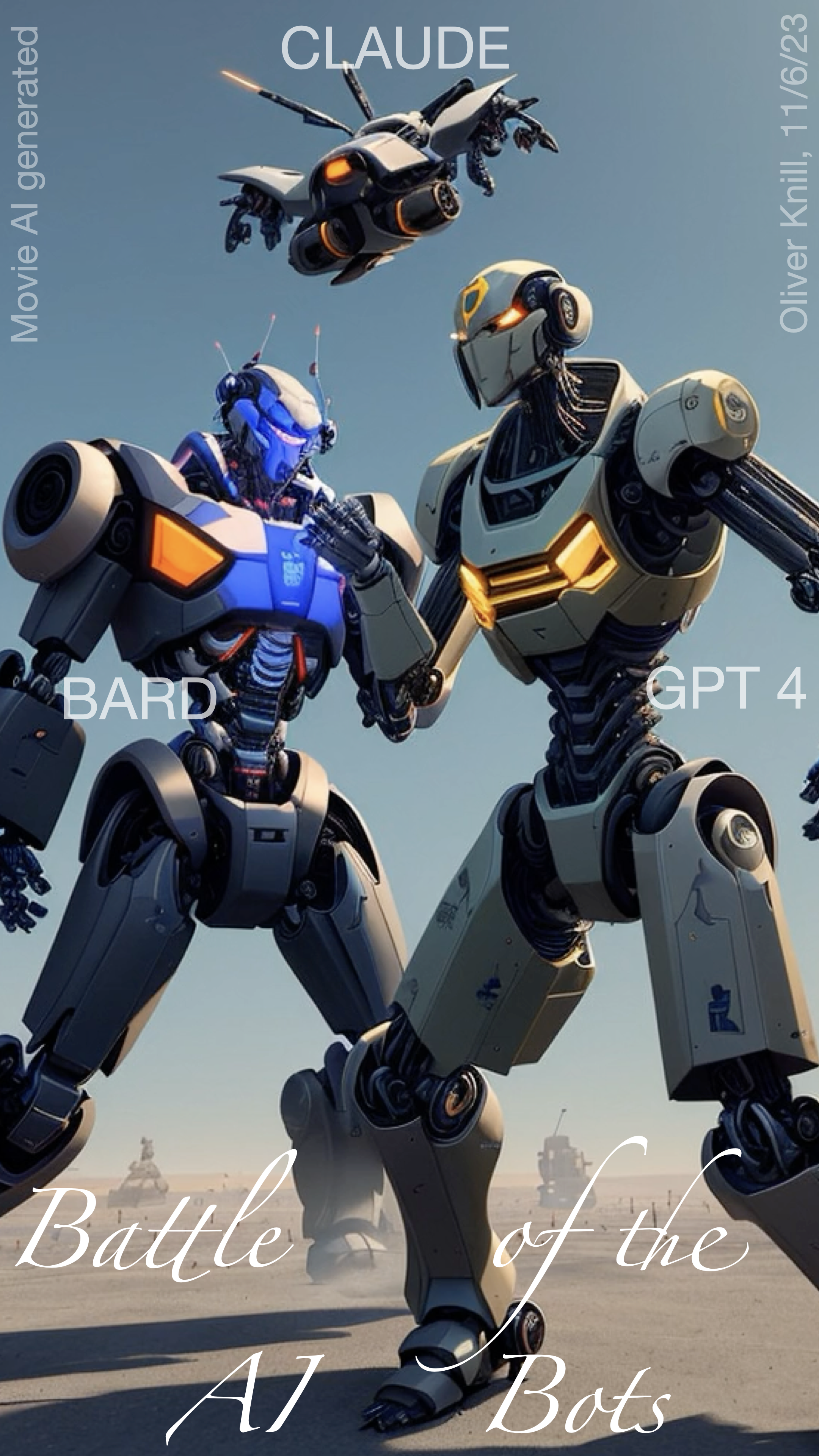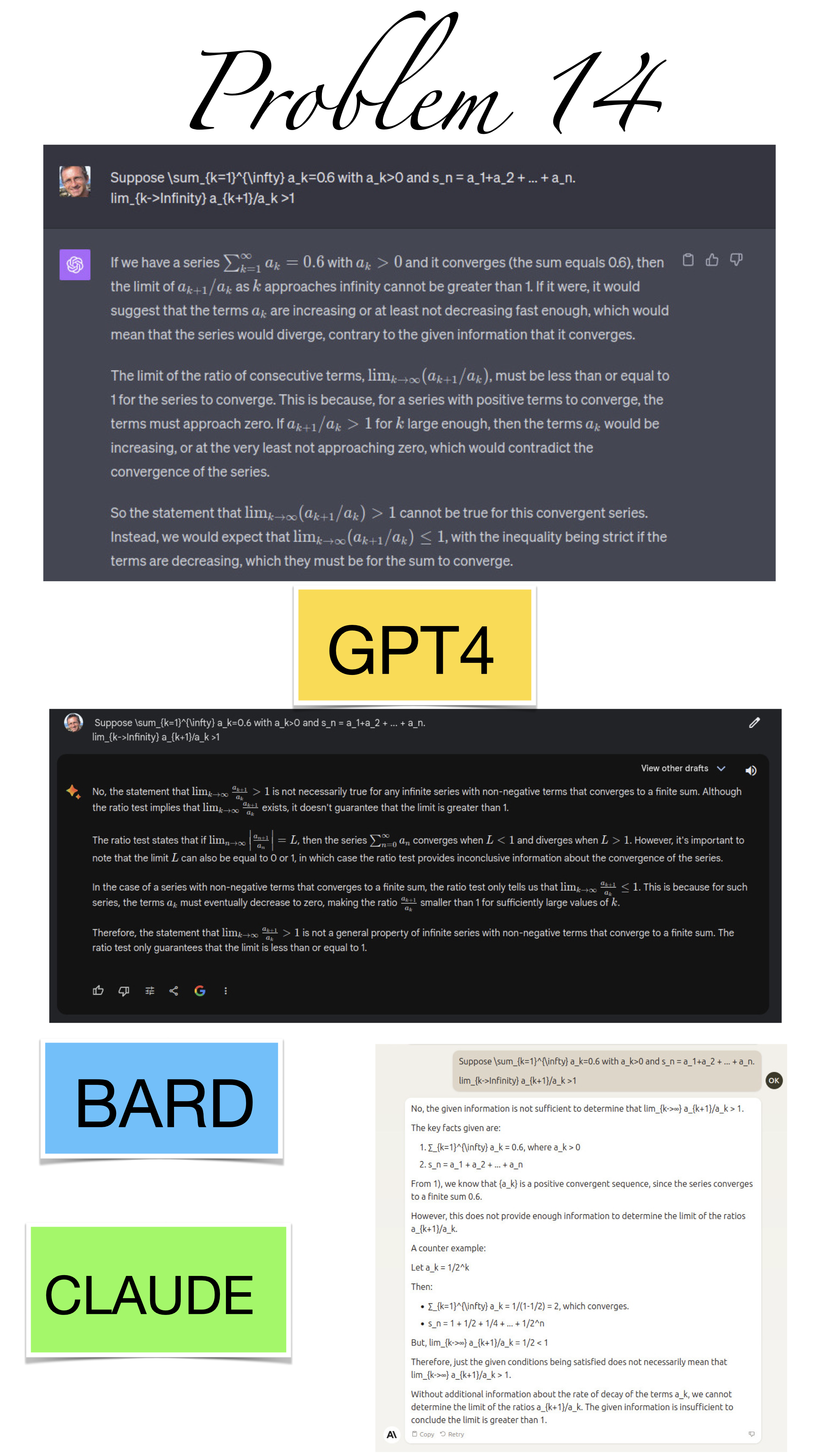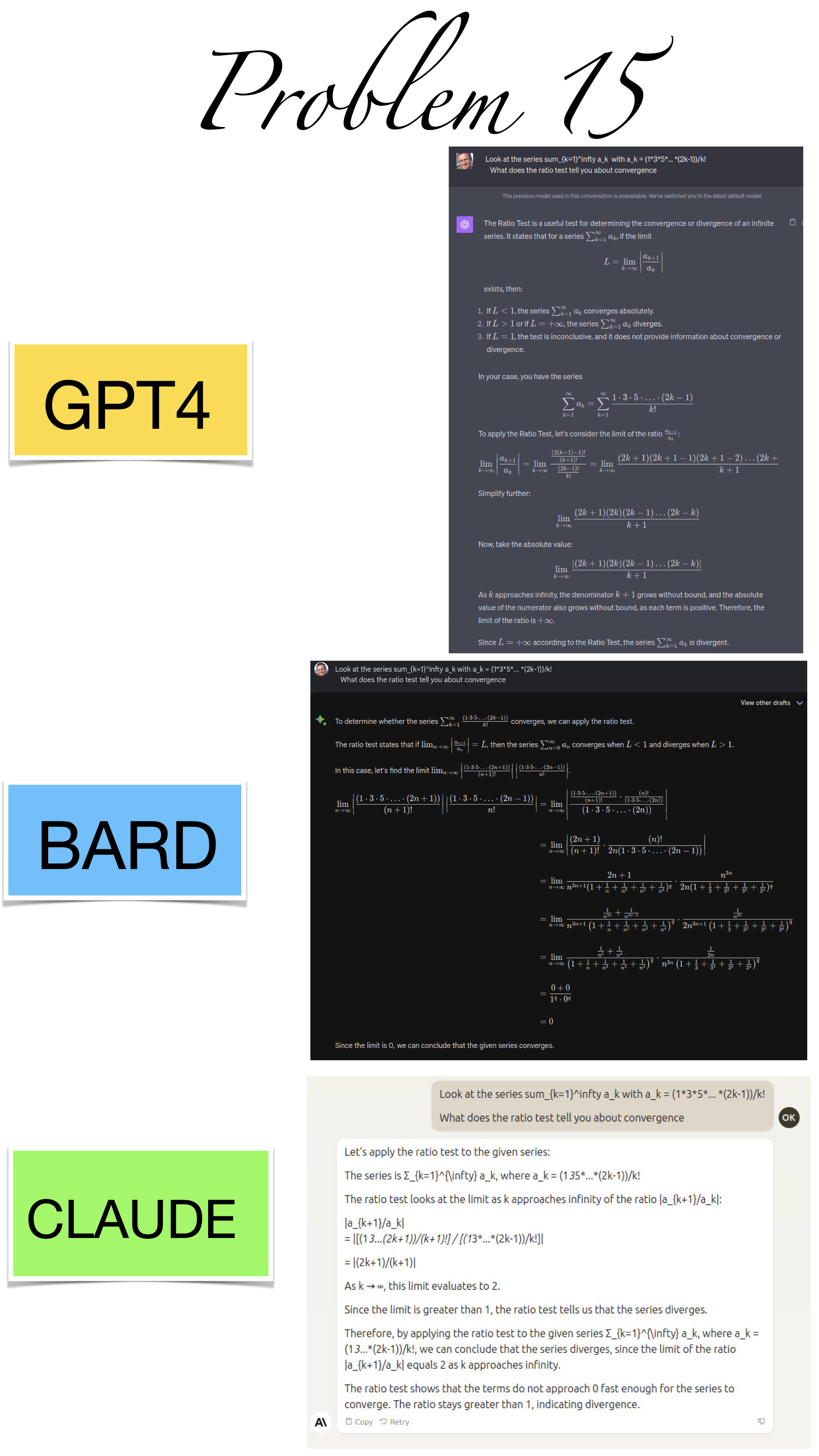 | Here are the pictures of the 1 minute short done before the second midterm in Math 1b. Three bots, GPT4, BARD, CLAUDE competed. I made a 35 frame slide show for that. The 1 minute short contains also the output captured from what the bots told. It can be inspected more closely here. Click onto a slide to see it large. |