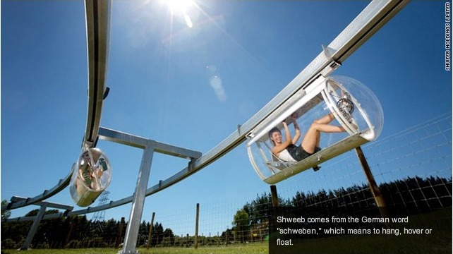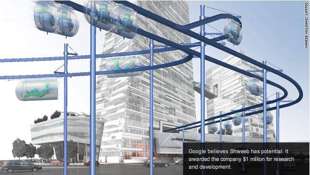| Added October 12, 2010: CNN article presents Schweeb's pedal powered pods. It is a great idea. The pictures look similar to this picture but a central idea is to let the passenger pedal. It merges biking with an areal tramway idea. |