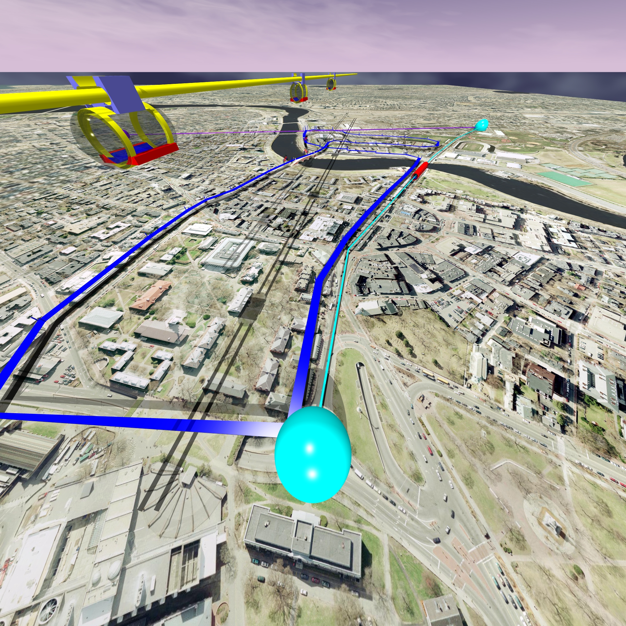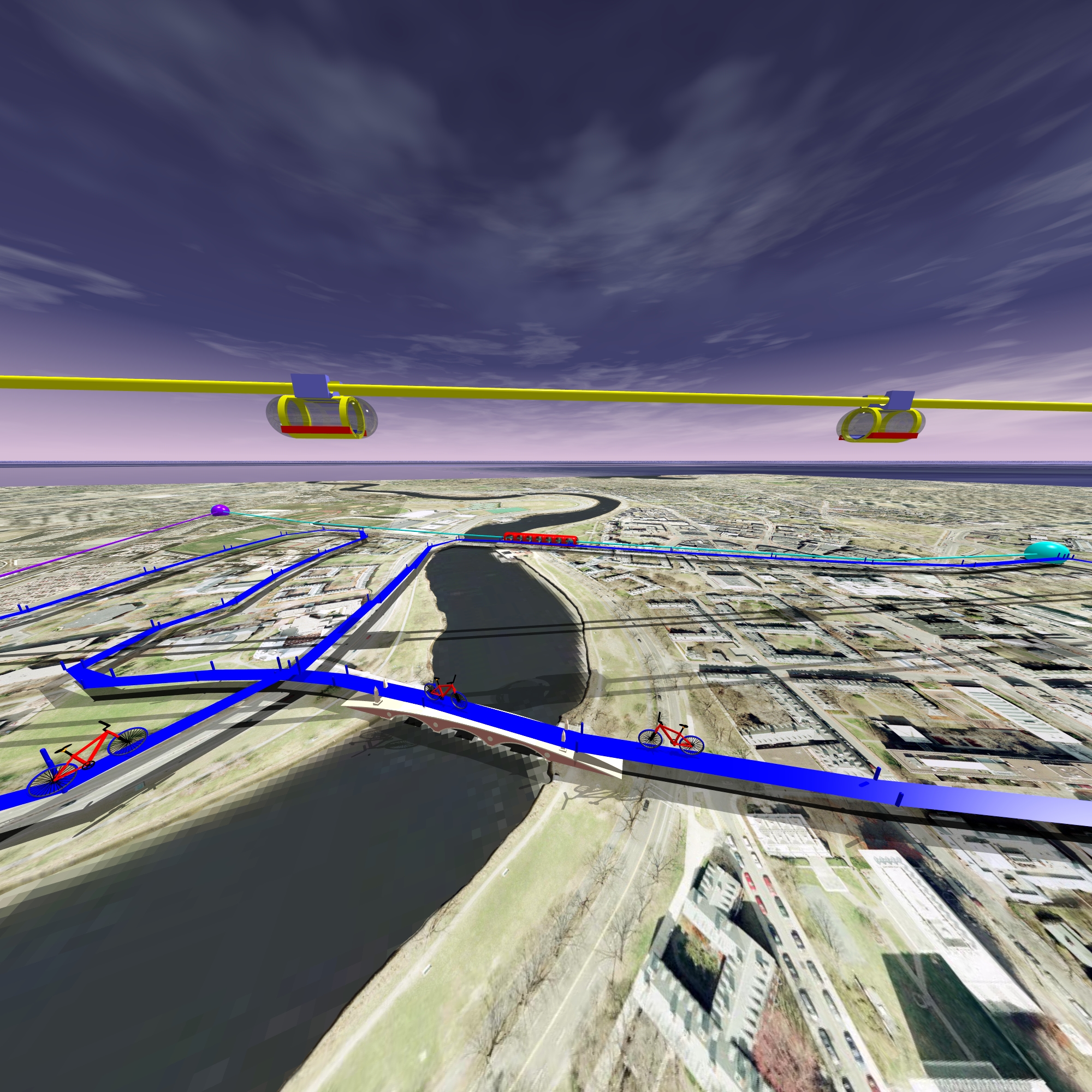 | Train or trolley lines could use existing streets or existing bridges. A futuristic cable-car solution has the advantage to be completely decoupled from the street traffic. Also a monorail solution could be constructed above the current car lanes. Special bicycle paths could be implemented right away. For bikers, it is important that they do not have to cross big streets, nor pass close to parked cars. Bicycle paths along existing streets are dangerous. A bicycle bridge over Memorial drive would be a first step. Alternatively, Memorial drive could be lowered into the ground near Harvard campus. |