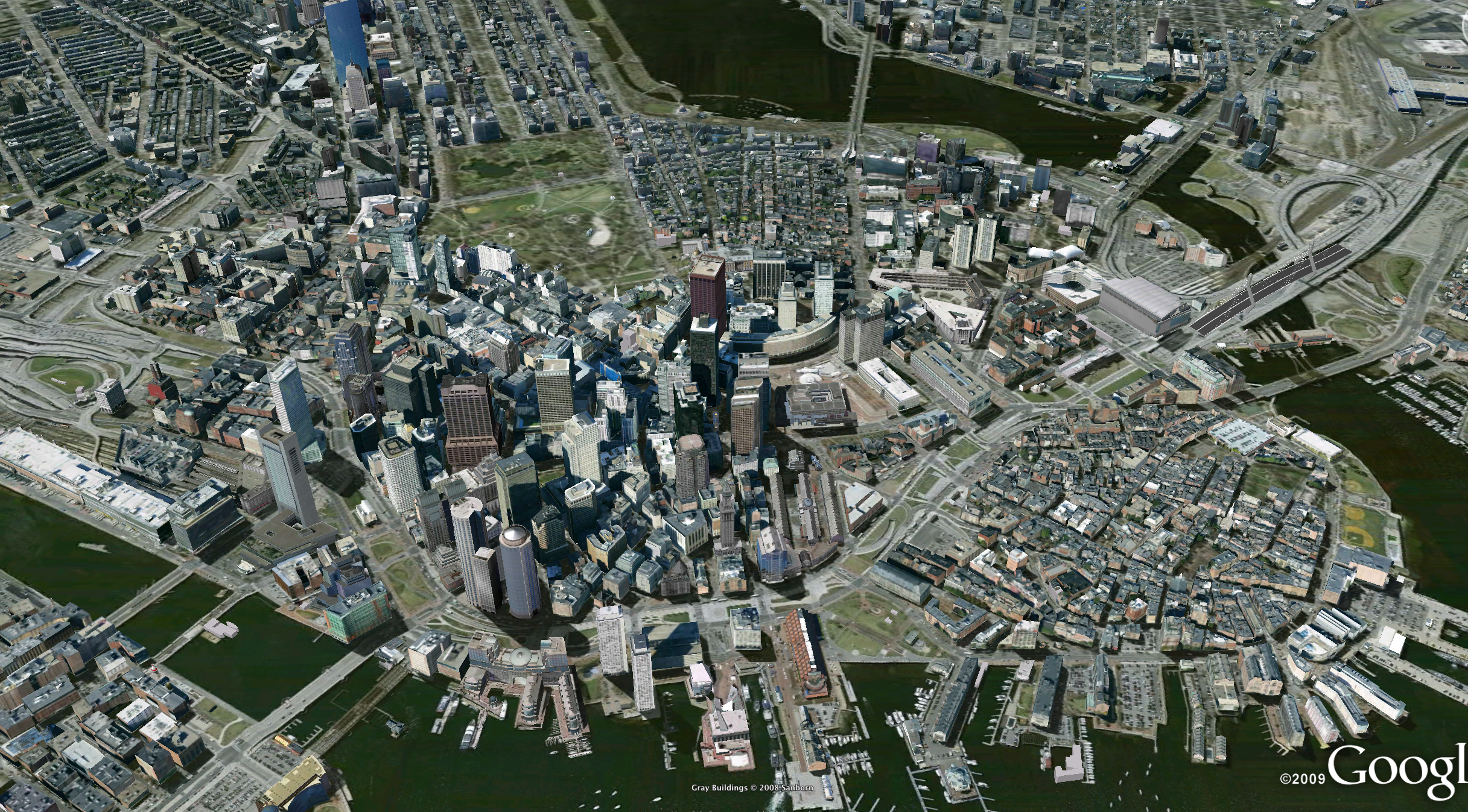 | A google earth flight done on December 12 2009. Challenges are to fly through through the arches of the Boston Bunker hill bridge, the entrance arc in Boston, the bunker hill monument, between the poles of the air port tower. A nice challenges would be to fly a certain task in the shortest amount of time. Google could have a serious "game" potential here. To build a parcour, I have experimented with "poles" placed with google sketchup. The problem is that flying with google sketch-up objects in the neighborhood slows down things considerably, especially if the machine also records the flights. The textures of the Boston buildings have considerably improved since 2008. Unfortunately, even 8 Gig of memory on the iMac are not enough to prevent frequent texture swap. Google earth has a serious limit on cache (500 Meg memory, 2 Gig Disk) which leads to frequent texture memory loss. The background music for this clip is "Superman" by "Five for fighting" which I got from the soundtrack album of the movie "bandits". Here is a large screen frame of Boston. |