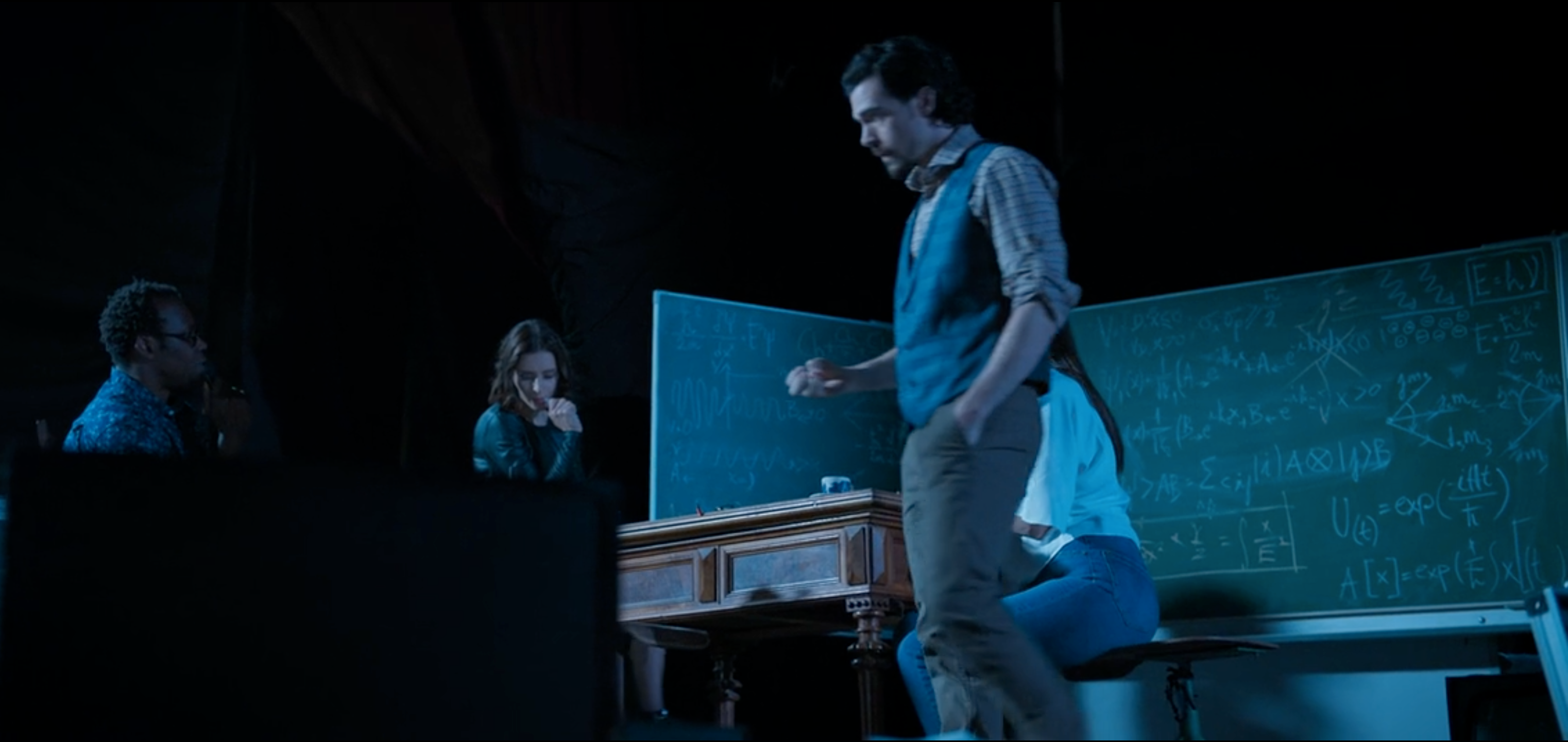 Four quantum scientists help a mad scientist to travel into another dimension. Some quantum mechanical formulas like the solution of the Schroedinger equation appear on a chalk board. This is one of the weirder horror movies.