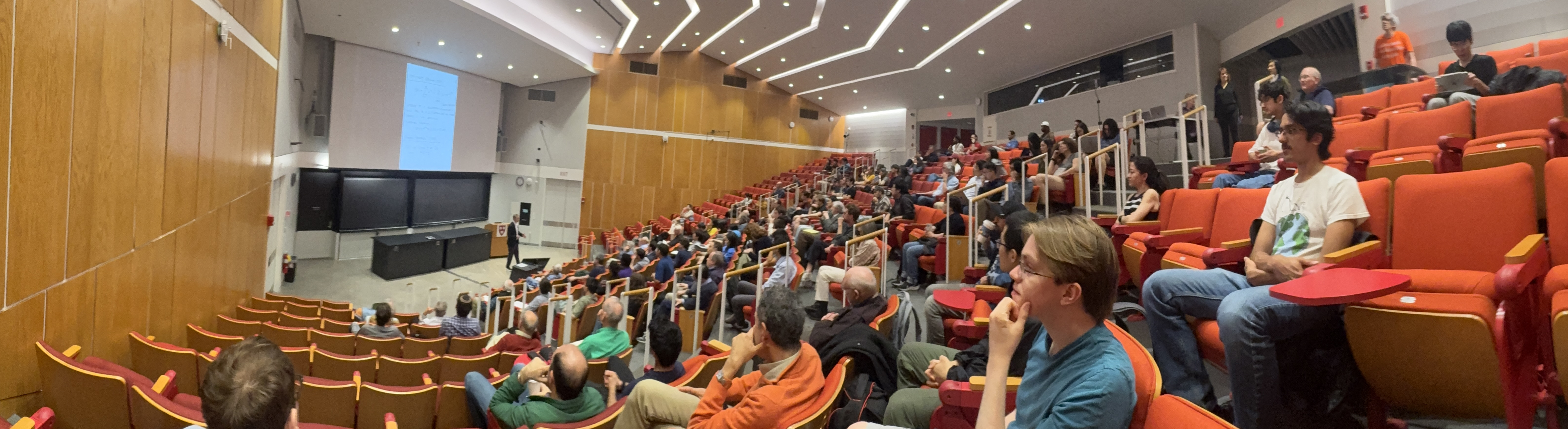 P.S. the Logician Paul Cohen was mentioned prominently by Sarnak. Cohen was pessimistic about the RH to be decidable. You can see Hugh Woodin below in the audience, I met him briefly before the talk and asked him what he thinks to be the most likely thing for RH and he is undecided (meaning he would not root for one of the possibilities that it could be true, false or undecidable) but pointed out that if it should be undecidable, it would be true (similarly like Goldbach but unlike the prime twin conjecture. If the later would be undecidable, it would not necessarily be true.).