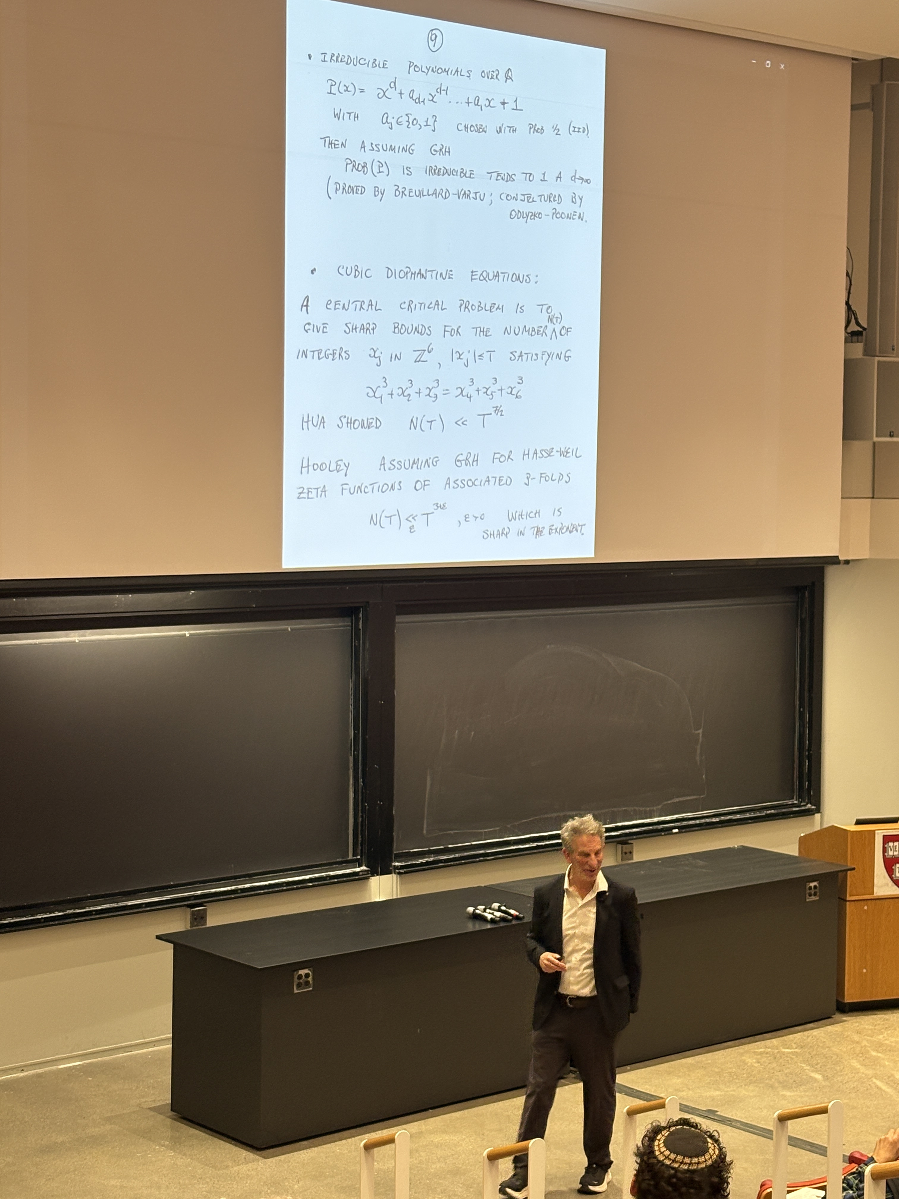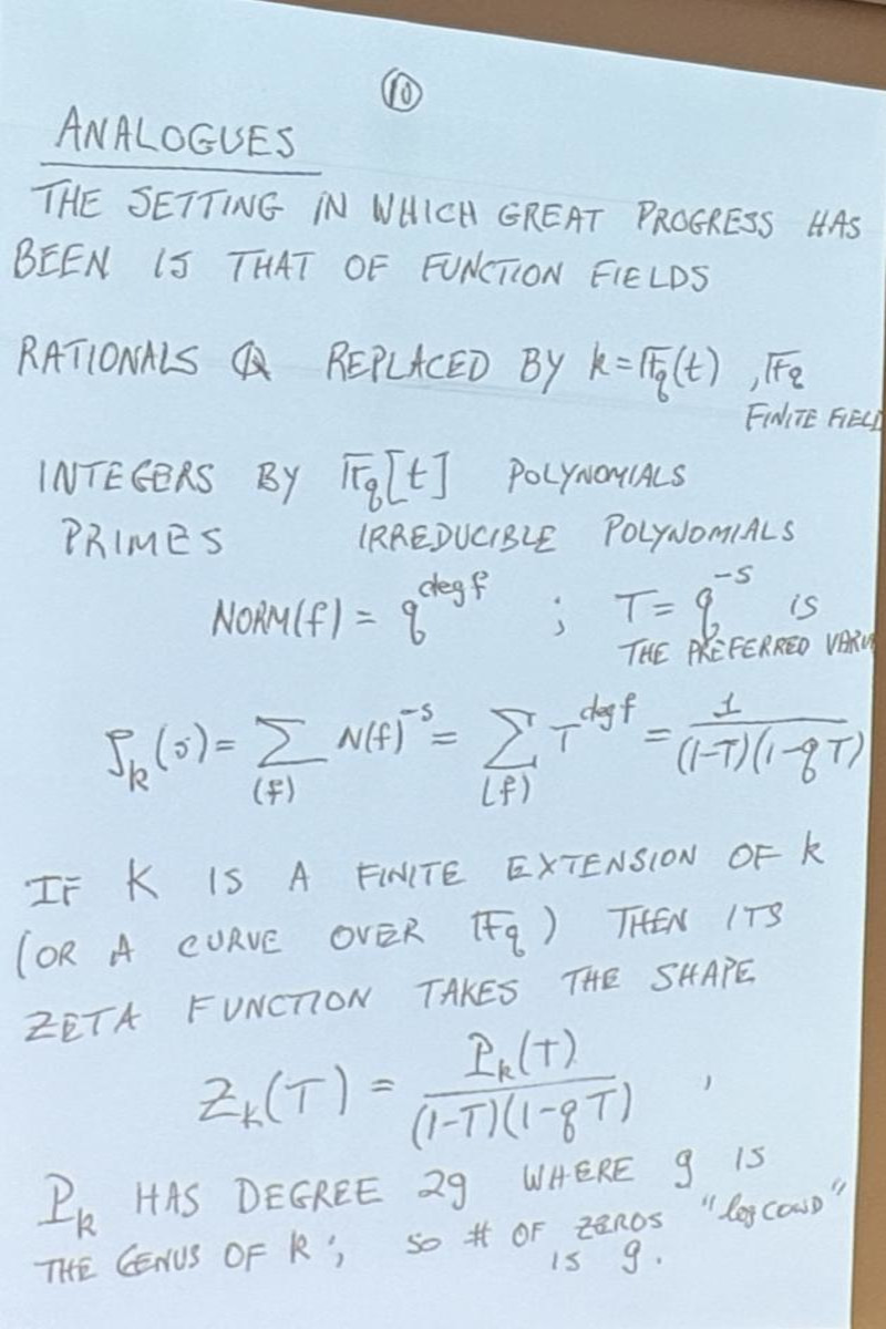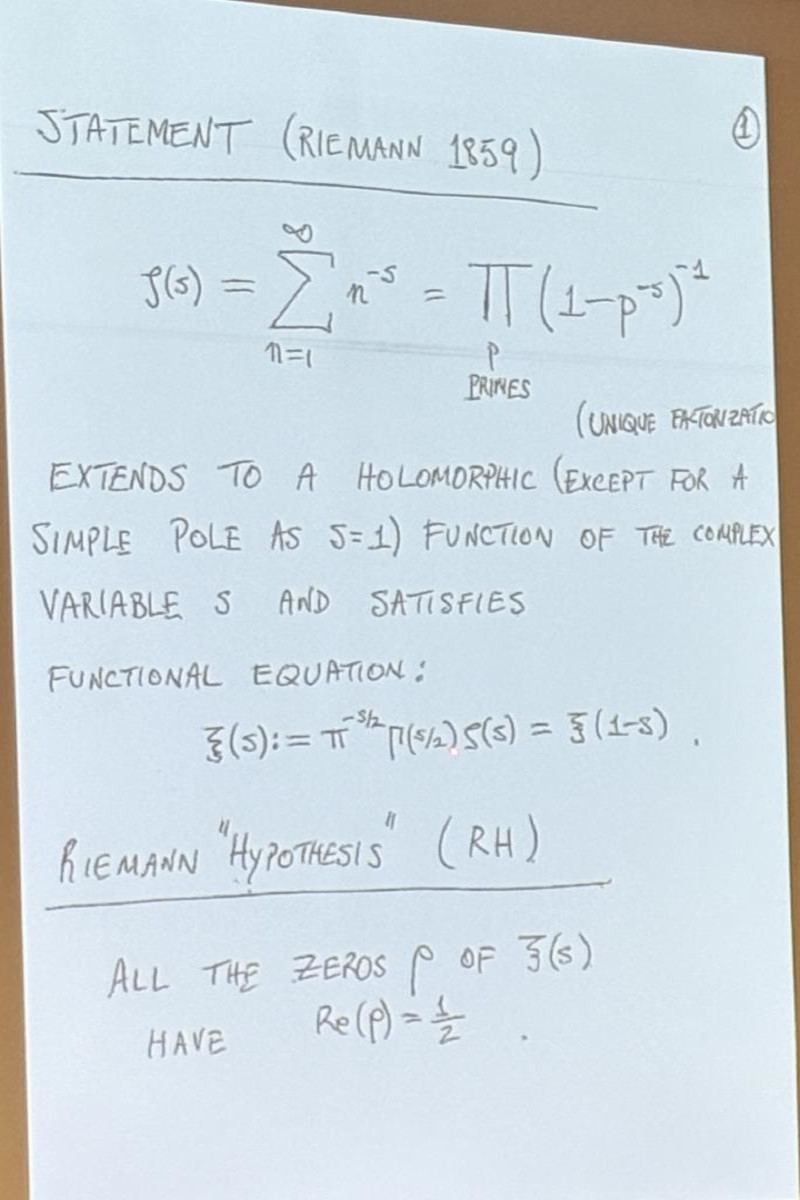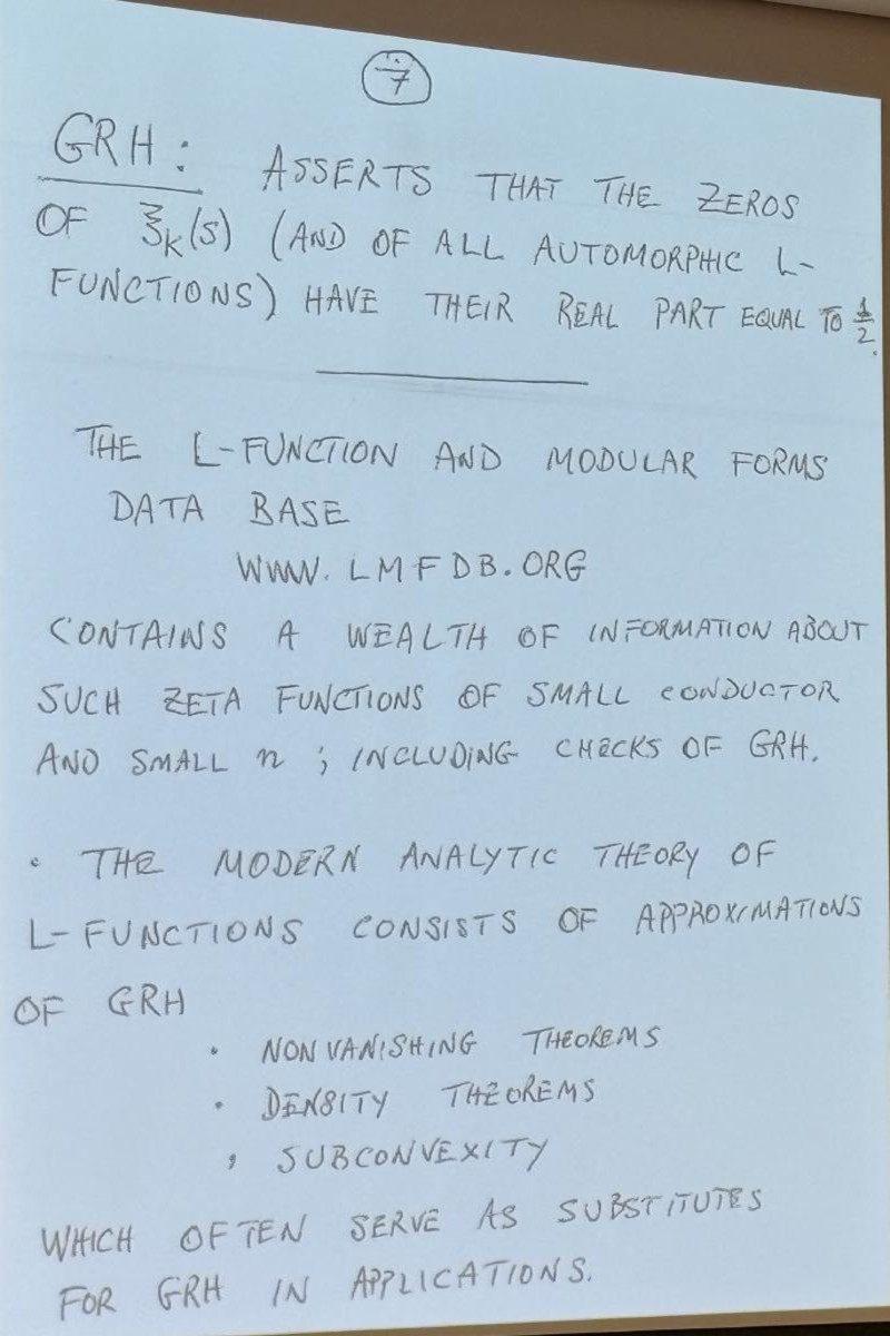 Sarnak's talk was stellar, spiked with humor or quipes that if RH would be proven to be false, no 1 million dollars could be won (but he hinted that somebody else would probably pay the million bucks in this case), and historical insight about how amazing Riemann was to find some small roots with paper and pencil and that he did not formulate RH as a conjecture as he had been more interested in the prime number theorem. I was happy that he also mentioned "statements for the person on the street" in the form of Mertens (see Pset problem 1.3 this year and the youtube short.) Sarnak is optimistic that RH hold, stressed that counter examples could be very, very large as only the log log(z) of the size z at which non-trivial roots might occur is expected to have reasonable size. He urged to look for extreme cases of L functions coming from Maass forms, where he hinted that AI could be helpful.
