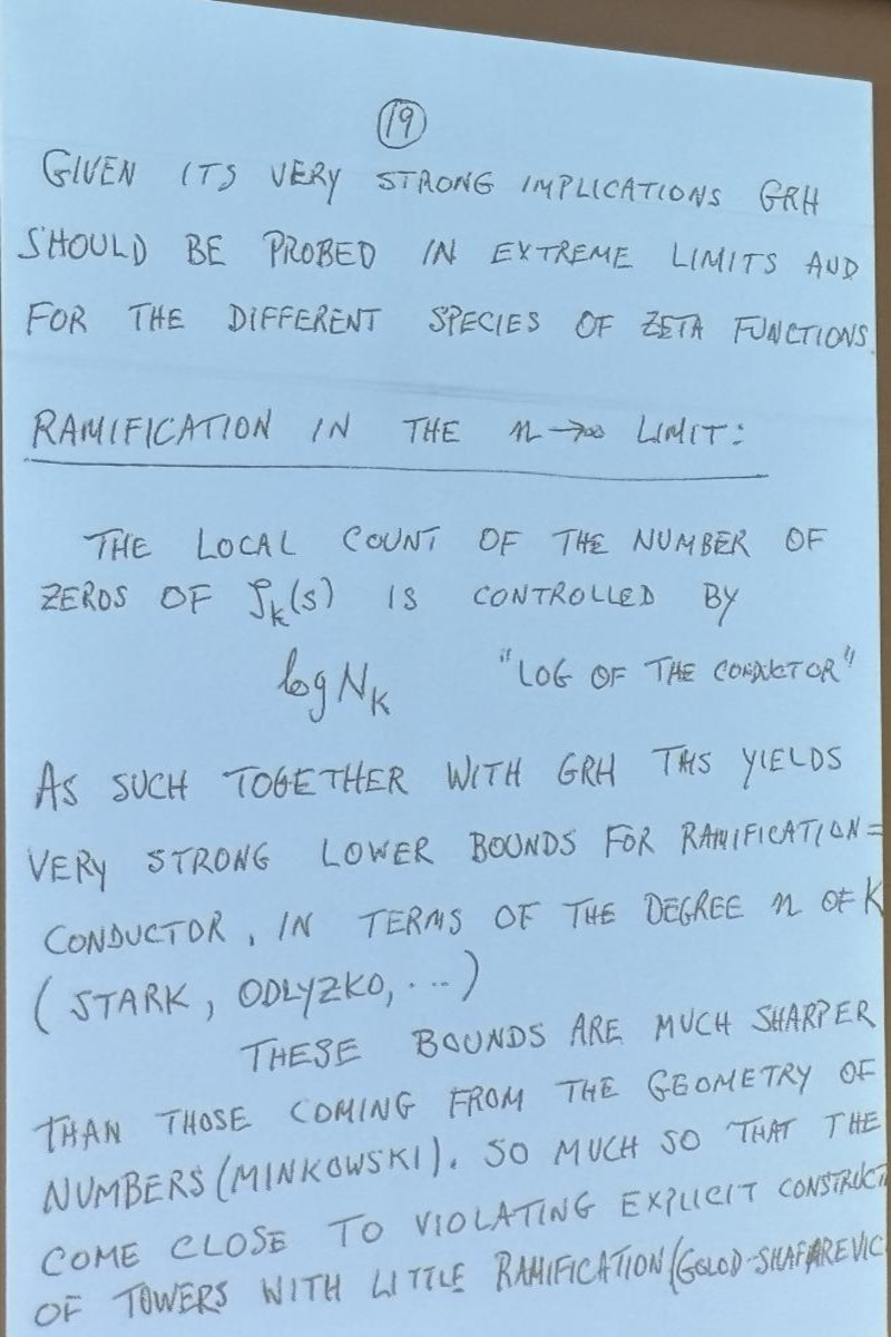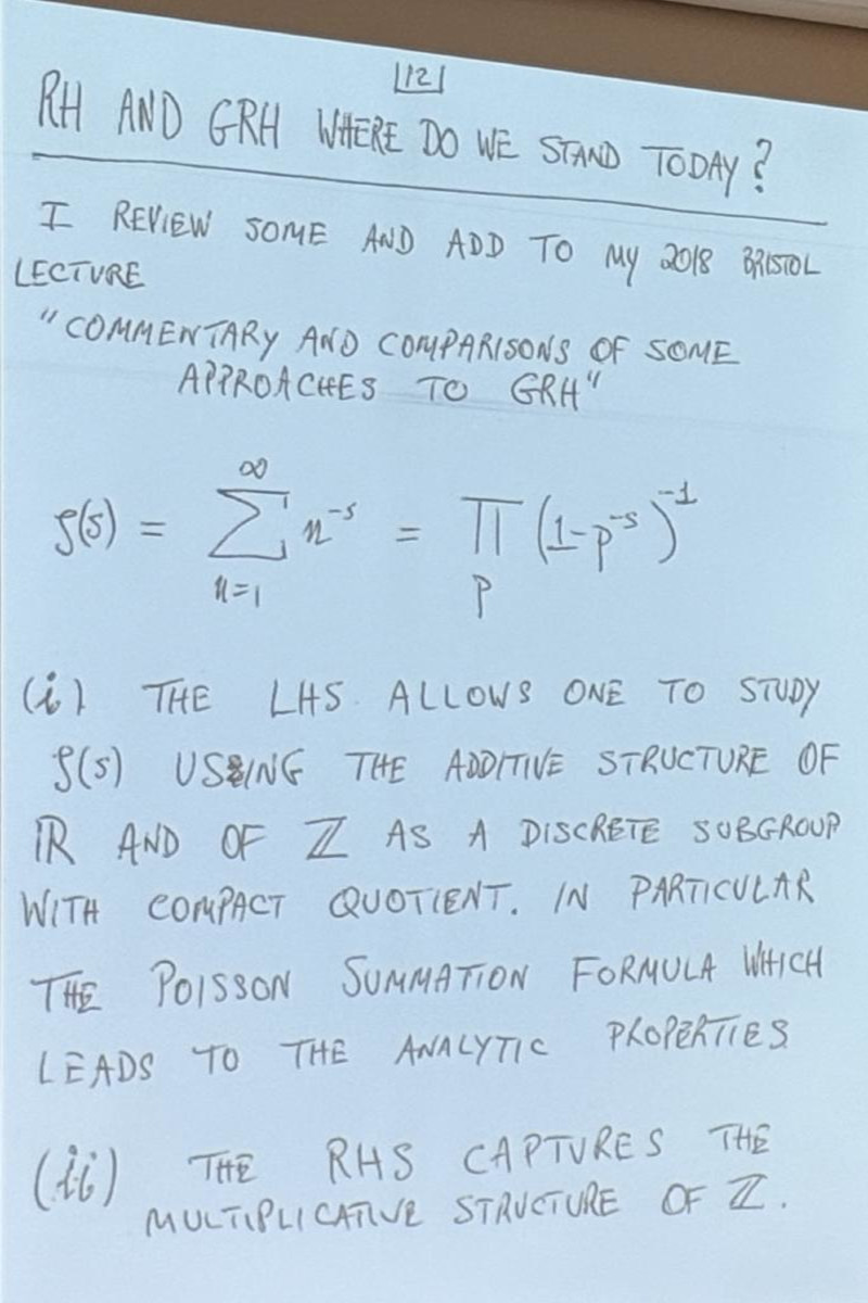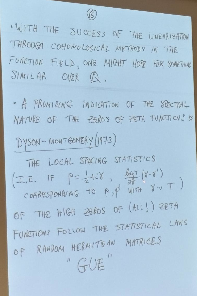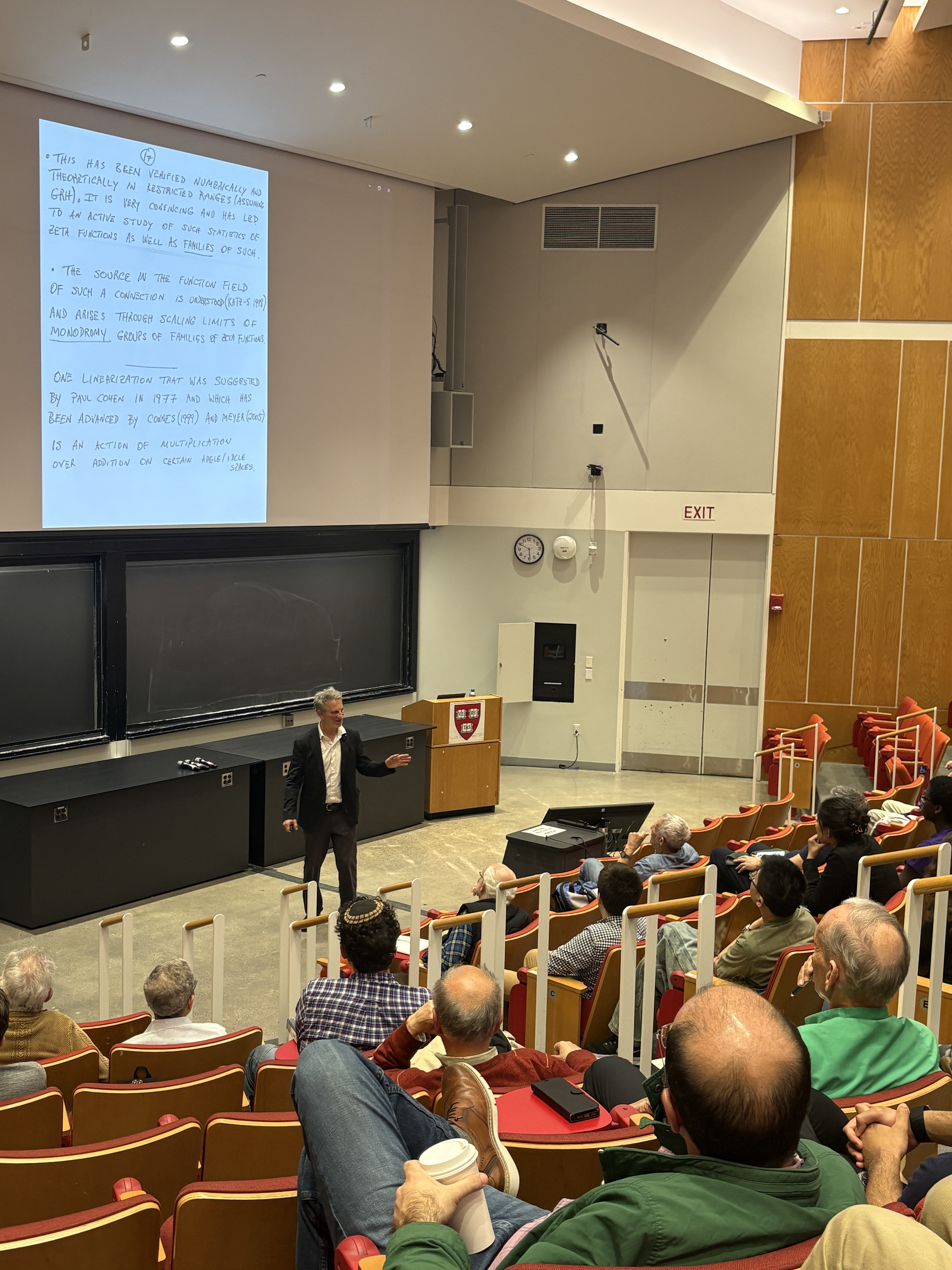 Sarnak's talk was stellar, spiked with humor or quipes that if RH would be proven to be false, no 1 million dollars could be won (but he hinted that somebody else would probably pay the million bucks in this case), and historical insight about how amazing Riemann was to find some small roots with paper and pencil and that he did not formulate RH as a conjecture as he had been more interested in the prime number theorem. I was happy that he also mentioned "statements for the person on the street" in the form of Mertens (see Pset problem 1.3 this year and the youtube short.) Sarnak is optimistic that RH hold, stressed that counter examples could be very, very large as only the log log(z) of the size z at which non-trivial roots might occur is expected to have reasonable size. He urged to look for extreme cases of L functions coming from Maass forms, where he hinted that AI could be helpful.