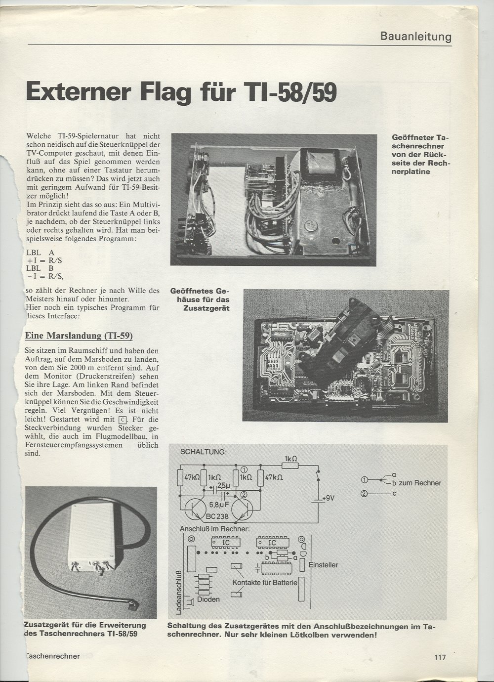 | In 1982, I built two interfaces for the TI 59 calculator. One was an "external flag" which could be used as an external joy stick, an other was a interface to control appliances. I wrote this up for a special edition of "Chip". Both things worked and the calculator survived all the surgery. |