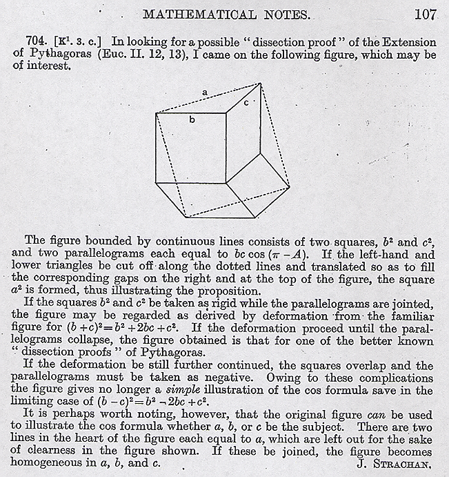 cos1, cos2: Dissections showing the Law of Cosines c2 = a2 + b2 - 2ab cos C for a triangle with an obtuse (PS, PDF) or acute (PS, PDF) angle at C. In the former case, attach two copies of the triangle to a square on side c, then translate and remove them so the remaining area can be dissected into squares on sides a,b and two parallelograms each of area -ab cos C. In the latter case, attach two parallelograms of area ab cos C and three copies of the triangle to a square on side c, then translate and remove the triangles to leave behind disjoint squares on sides a,b. Either of these generalizes an ancient dissection picture for the Pythagorean theorem, which can be recovered by making C a right angle.