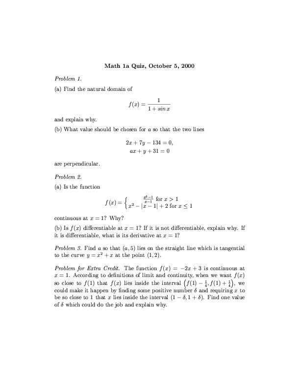 Math 1a - Quiz on October 5, 2000, Section of Yum-Tong Siu