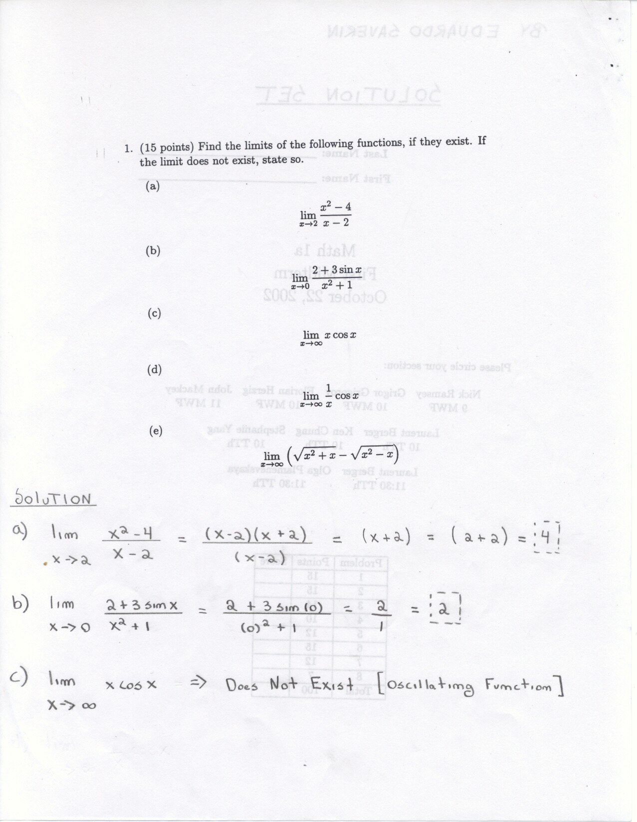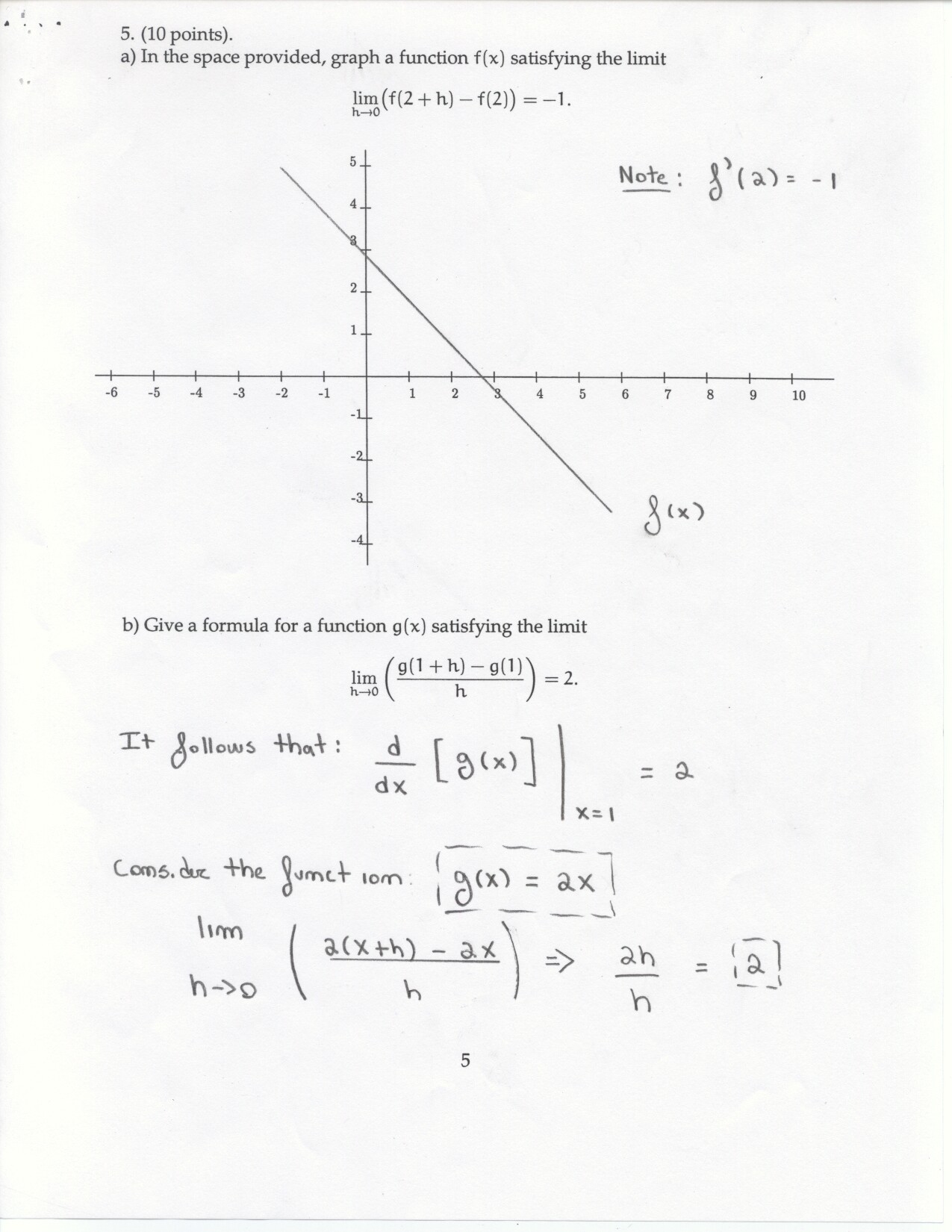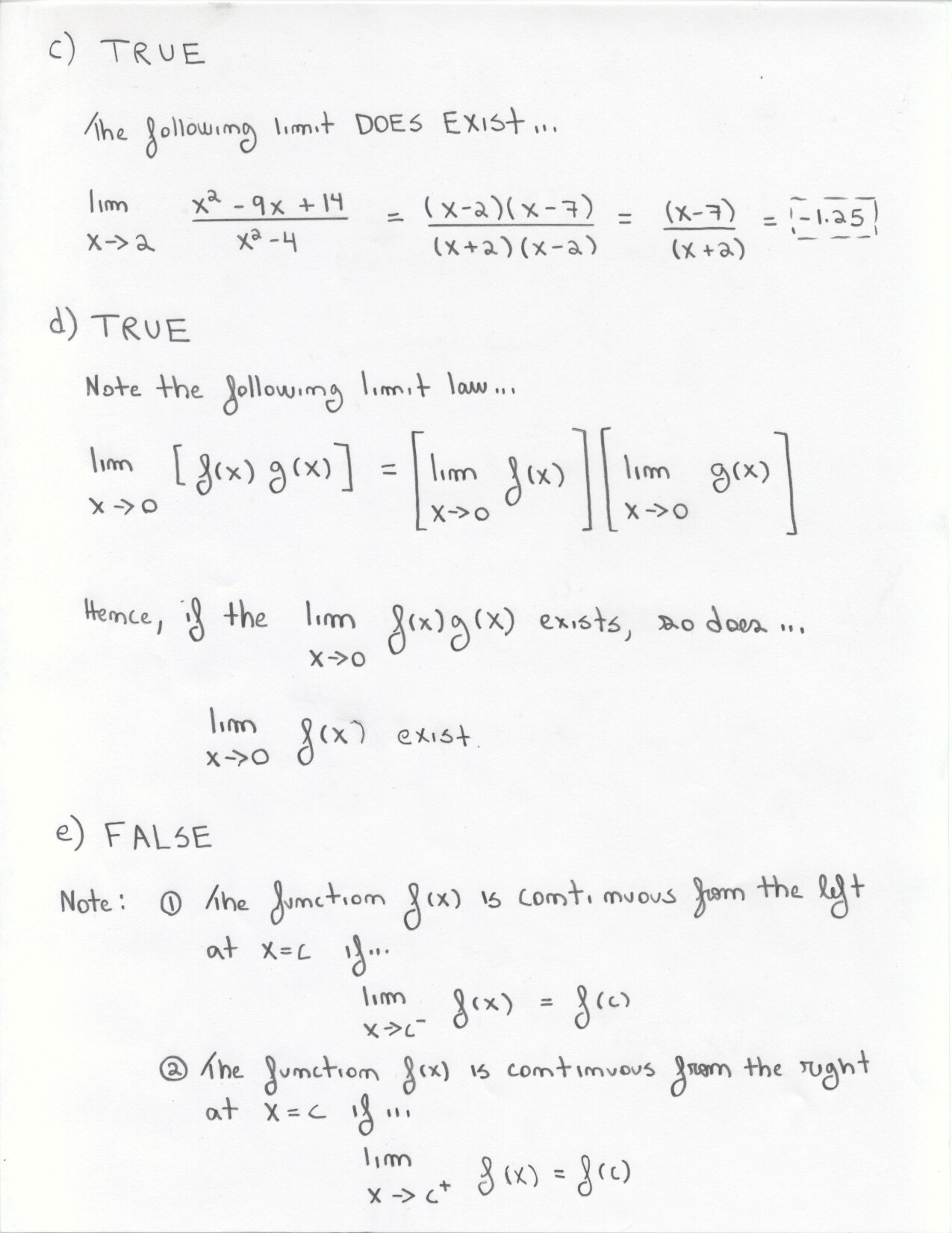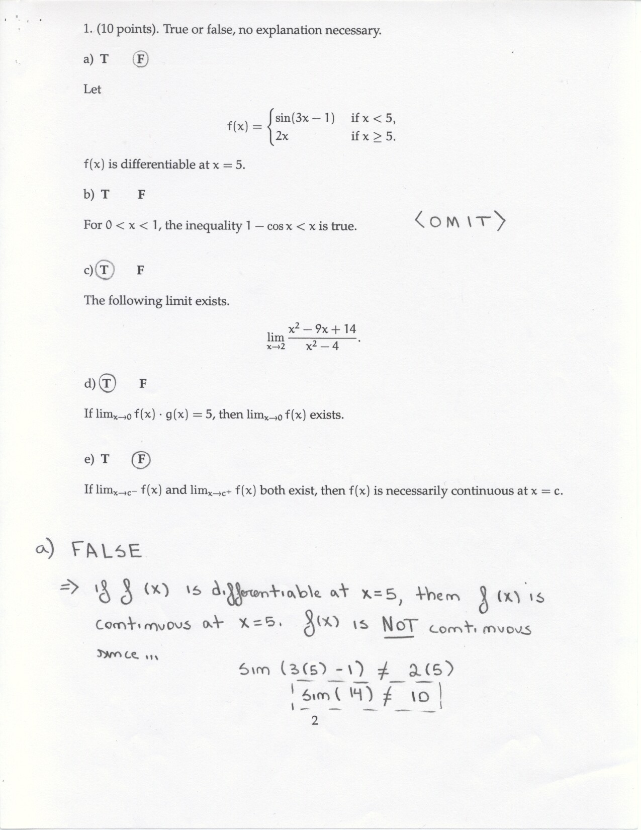The following problems can be omitted (since we didn't emphasize the material this year) Review problems # 8bc and 37 Jan. 19, 2000 exam (Winters) # 12ce Jan. 23, 2000 exam (Siu): long and challenging . . . May 23, 2000 exam: #6. Note: Solutions for the May 2000 exam have been fixed and are back up. Additional corrections to Fall 2002: #1(a) lim x to 2 should be written two more times. #1(c) Unlike the damped oscillations in part (d), these are getting wilder as x increases. #2: if the explanation given in the corrections is not adequate, please see Ex 6 p. 137 in your text. #3c arctan x would have two horizontal asymptotes. #4. When you give a linearization, make sure that what you have is the equation of a line! L (x) = f(a) + f'(a) (x-a) or in this case L(x) = f(25) + f'(25) (x-25). It is not necessary to use this "formula" in order to get the linear approximation. The correct answer is 5.1 as stated in the corrections. #6: I would say that the velocity graph does NOT have a vertical asymptote at x=3, but rather a jump discontinuity. Corrections to spring 1998: # 1(d) False: let f(x) = 1/x and g(x) = 5/x. The limit rule quoted is only true if both limits independently exist. 1(e) The statement is false but the reason given doesn't make sense. If the function is continuous from the left and right with the definitions stated then the function must be continous. However, the left and right hand limits could be different, or we could have the left and right hand limits equal but the function defined at c to be something entirely different. #5: f'(2) is not 1. This says that as h approaches 0 the difference between f at 2+h and at 2 approaches -1. Try f(x) = 4 for x <2 and f(x) = 3 for x>2 for example.