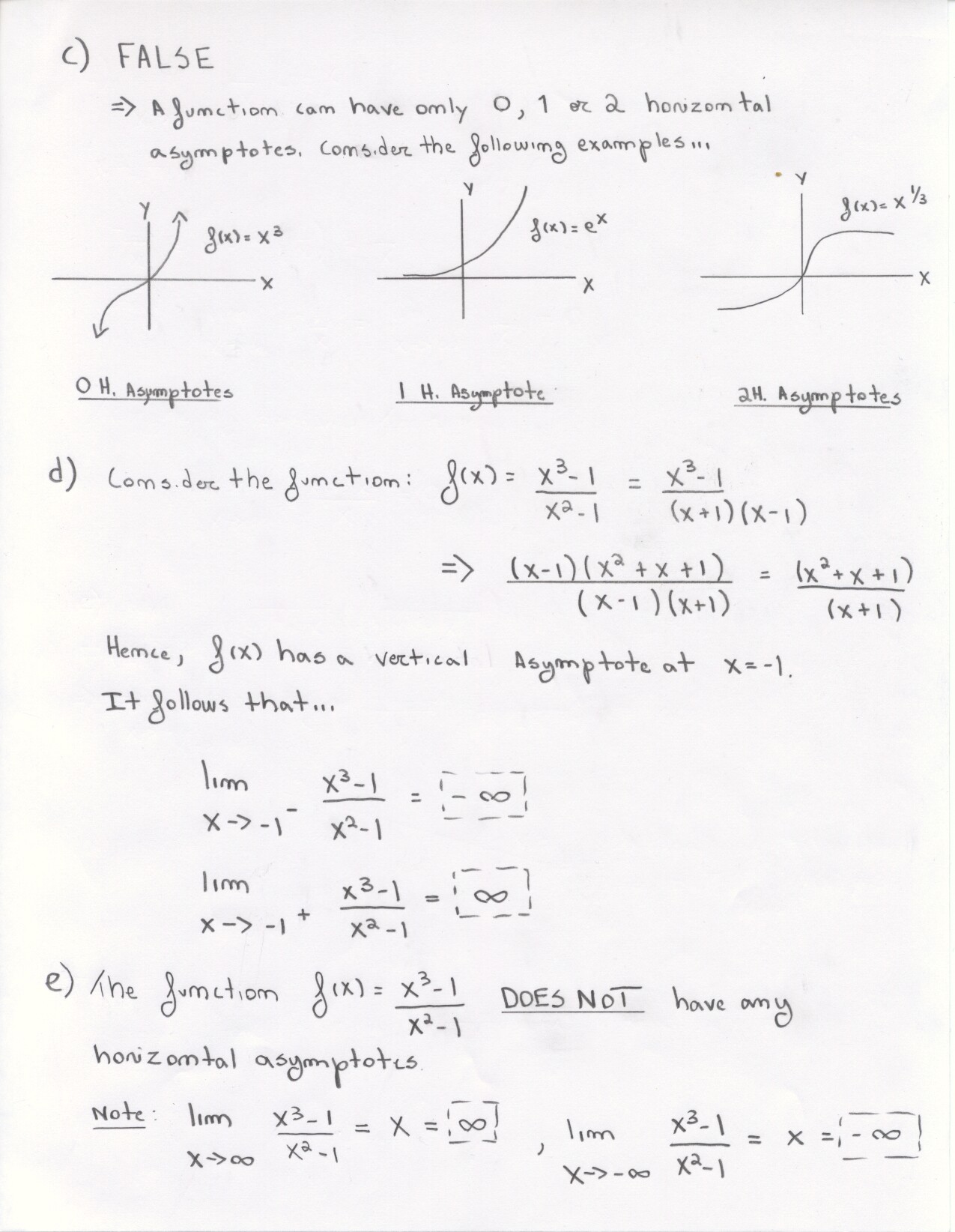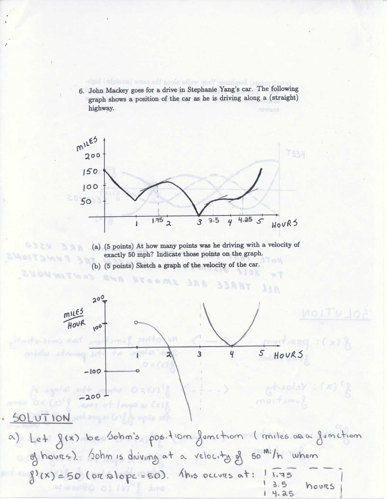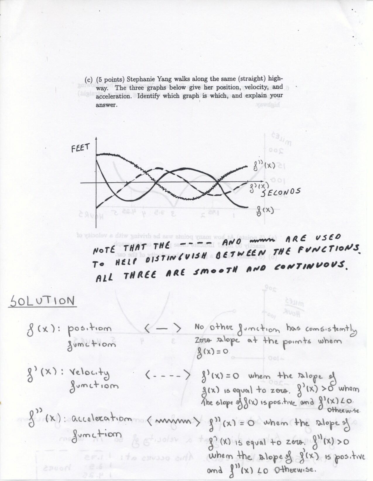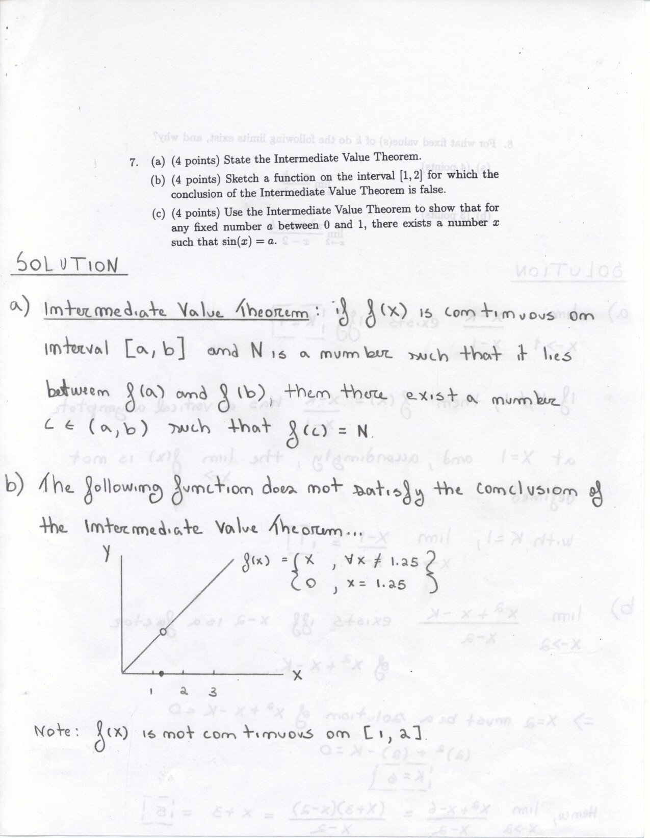 The following problems can be omitted (since we didn't emphasize the material this year) Review problems # 8bc and 37 Jan. 19, 2000 exam (Winters) # 12ce Jan. 23, 2000 exam (Siu): long and challenging . . . May 23, 2000 exam: #6. Note: Solutions for the May 2000 exam have been fixed and are back up. Additional corrections to Fall 2002: #1(a) lim x to 2 should be written two more times. #1(c) Unlike the damped oscillations in part (d), these are getting wilder as x increases. #2: if the explanation given in the corrections is not adequate, please see Ex 6 p. 137 in your text. #3c arctan x would have two horizontal asymptotes. #4. When you give a linearization, make sure that what you have is the equation of a line! L (x) = f(a) + f'(a) (x-a) or in this case L(x) = f(25) + f'(25) (x-25). It is not necessary to use this "formula" in order to get the linear approximation. The correct answer is 5.1 as stated in the corrections. #6: I would say that the velocity graph does NOT have a vertical asymptote at x=3, but rather a jump discontinuity. Corrections to spring 1998: # 1(d) False: let f(x) = 1/x and g(x) = 5/x. The limit rule quoted is only true if both limits independently exist. 1(e) The statement is false but the reason given doesn't make sense. If the function is continuous from the left and right with the definitions stated then the function must be continous. However, the left and right hand limits could be different, or we could have the left and right hand limits equal but the function defined at c to be something entirely different. #5: f'(2) is not 1. This says that as h approaches 0 the difference between f at 2+h and at 2 approaches -1. Try f(x) = 4 for x <2 and f(x) = 3 for x>2 for example.