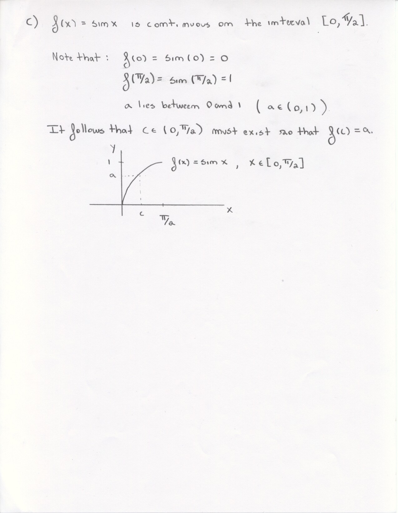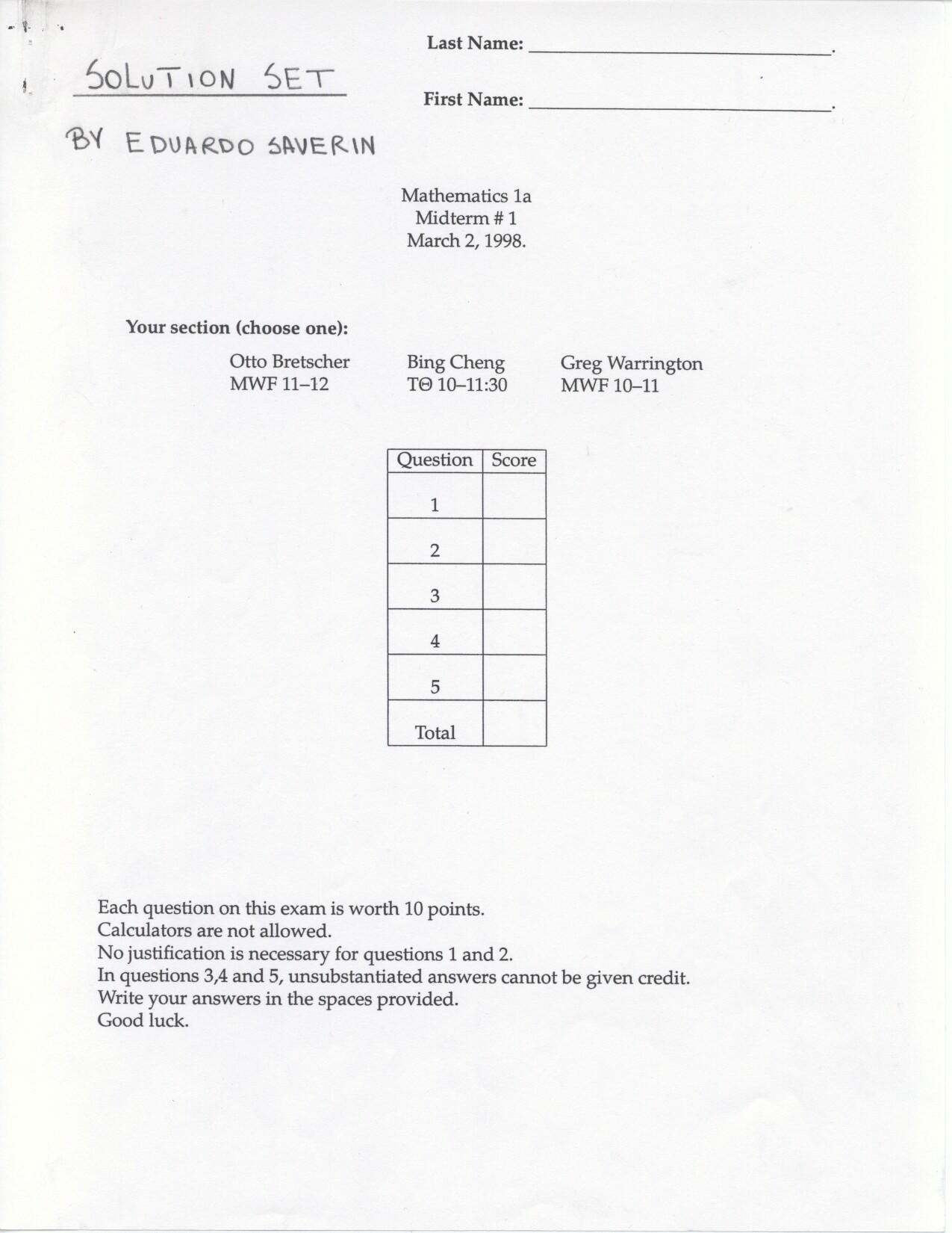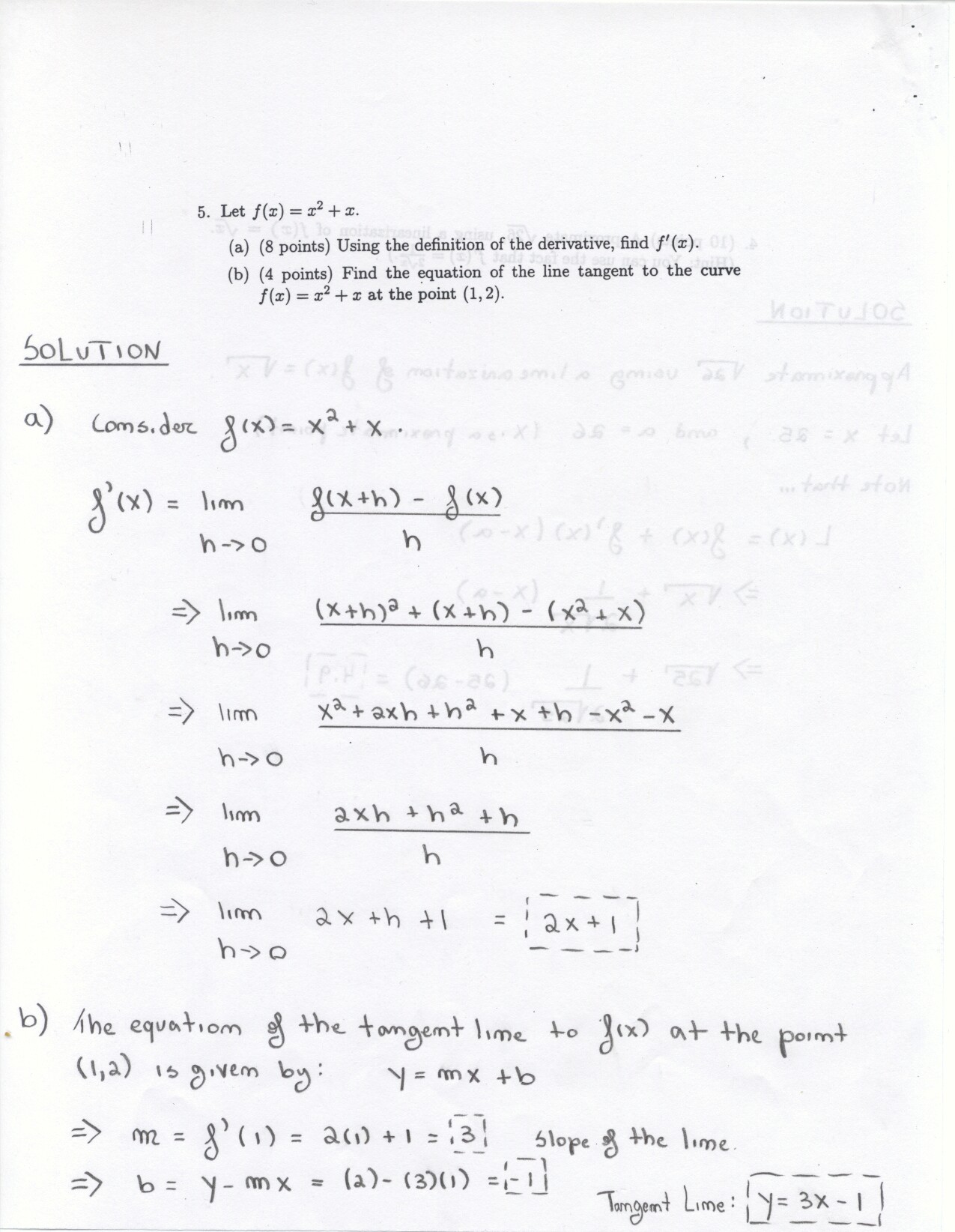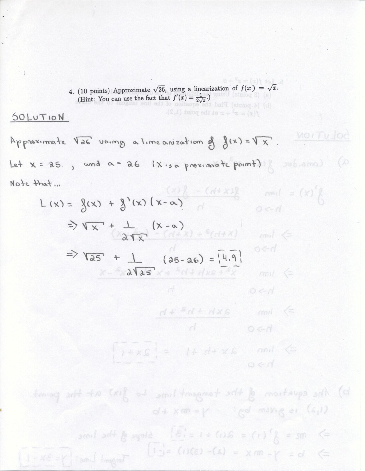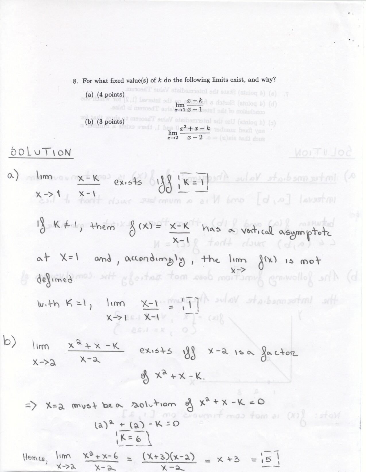 The following problems can be omitted (since we didn't emphasize the material this year) Review problems # 8bc and 37 Jan. 19, 2000 exam (Winters) # 12ce Jan. 23, 2000 exam (Siu): long and challenging . . . May 23, 2000 exam: #6. Note: Solutions for the May 2000 exam have been fixed and are back up. Additional corrections to Fall 2002: #1(a) lim x to 2 should be written two more times. #1(c) Unlike the damped oscillations in part (d), these are getting wilder as x increases. #2: if the explanation given in the corrections is not adequate, please see Ex 6 p. 137 in your text. #3c arctan x would have two horizontal asymptotes. #4. When you give a linearization, make sure that what you have is the equation of a line! L (x) = f(a) + f'(a) (x-a) or in this case L(x) = f(25) + f'(25) (x-25). It is not necessary to use this "formula" in order to get the linear approximation. The correct answer is 5.1 as stated in the corrections. #6: I would say that the velocity graph does NOT have a vertical asymptote at x=3, but rather a jump discontinuity. Corrections to spring 1998: # 1(d) False: let f(x) = 1/x and g(x) = 5/x. The limit rule quoted is only true if both limits independently exist. 1(e) The statement is false but the reason given doesn't make sense. If the function is continuous from the left and right with the definitions stated then the function must be continous. However, the left and right hand limits could be different, or we could have the left and right hand limits equal but the function defined at c to be something entirely different. #5: f'(2) is not 1. This says that as h approaches 0 the difference between f at 2+h and at 2 approaches -1. Try f(x) = 4 for x <2 and f(x) = 3 for x>2 for example.