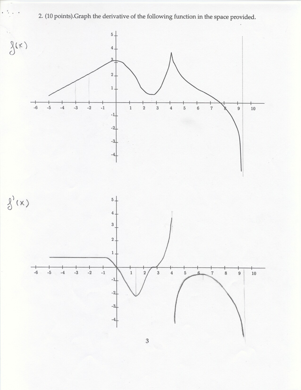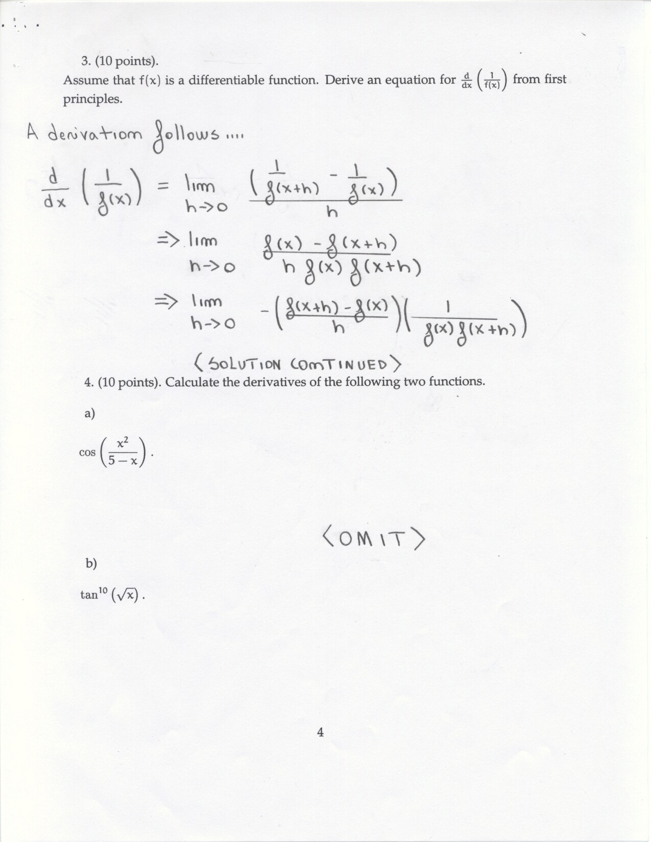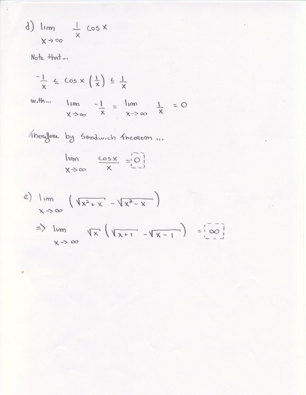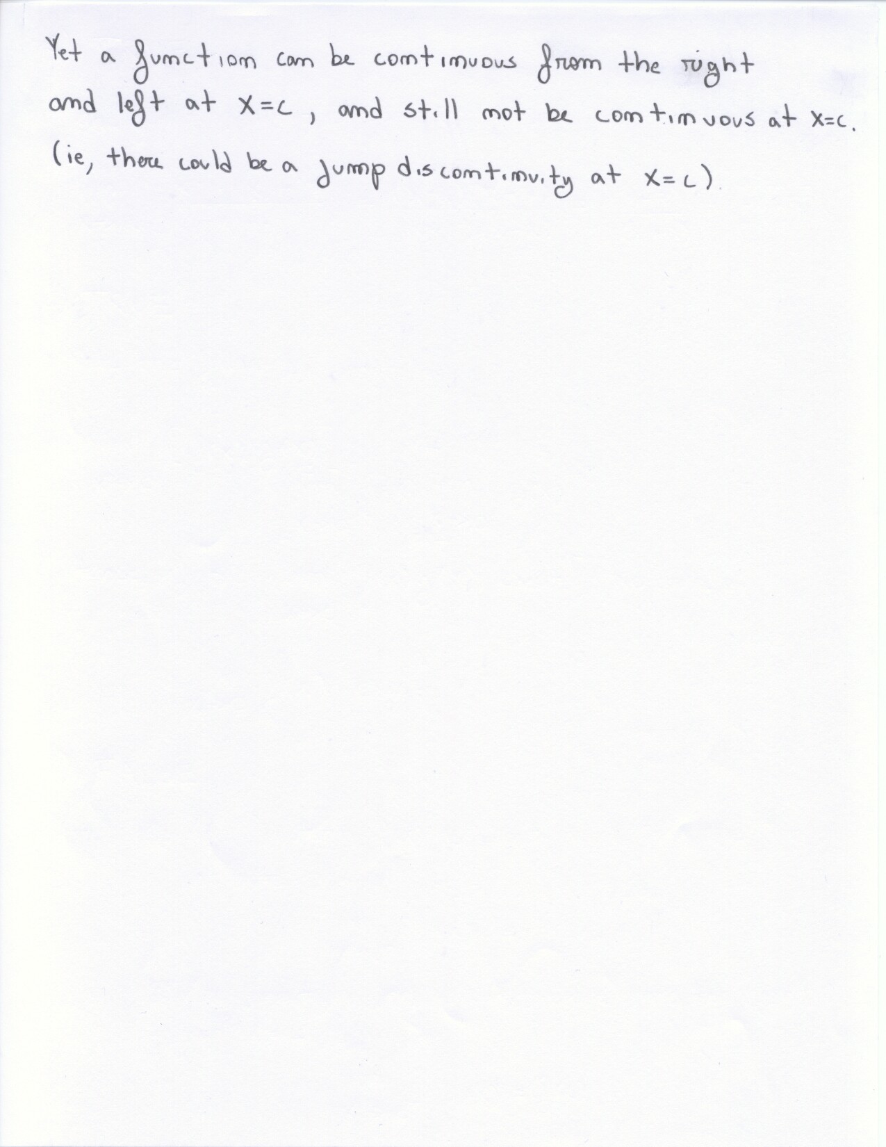 The following problems can be omitted (since we didn't emphasize the material this year) Review problems # 8bc and 37 Jan. 19, 2000 exam (Winters) # 12ce Jan. 23, 2000 exam (Siu): long and challenging . . . May 23, 2000 exam: #6. Note: Solutions for the May 2000 exam have been fixed and are back up. Additional corrections to Fall 2002: #1(a) lim x to 2 should be written two more times. #1(c) Unlike the damped oscillations in part (d), these are getting wilder as x increases. #2: if the explanation given in the corrections is not adequate, please see Ex 6 p. 137 in your text. #3c arctan x would have two horizontal asymptotes. #4. When you give a linearization, make sure that what you have is the equation of a line! L (x) = f(a) + f'(a) (x-a) or in this case L(x) = f(25) + f'(25) (x-25). It is not necessary to use this "formula" in order to get the linear approximation. The correct answer is 5.1 as stated in the corrections. #6: I would say that the velocity graph does NOT have a vertical asymptote at x=3, but rather a jump discontinuity. Corrections to spring 1998: # 1(d) False: let f(x) = 1/x and g(x) = 5/x. The limit rule quoted is only true if both limits independently exist. 1(e) The statement is false but the reason given doesn't make sense. If the function is continuous from the left and right with the definitions stated then the function must be continous. However, the left and right hand limits could be different, or we could have the left and right hand limits equal but the function defined at c to be something entirely different. #5: f'(2) is not 1. This says that as h approaches 0 the difference between f at 2+h and at 2 approaches -1. Try f(x) = 4 for x <2 and f(x) = 3 for x>2 for example.