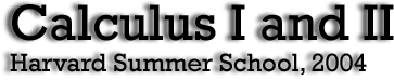 Welcome to Math S-1abThis course meets Monday-Friday, 10am-noon in SC 309. The discussion section meets Monday-Friday, 2-3pm in SC 310. In this course, we'll cover the fundamental notions of Calculus. First, we'll review the notion of function. Next, we'll explore infinity and the notion of limit. These ideas will be illustrated with sequences and series. The concepts of function and limit are basic, and when we're comfortable with those ideas, we'll be ready to embark upon one of the greatest journey's of human history: a journey through the world of Calculus! We'll begin our journey with the the derivative. With this new notion, countless problems which once perplexed and stymied the human mind become solvable! Many problems, which previously required laborious techniques to solve, now can be dismissed in a few well thought lines. You will solve many such problems yourselves. Next, we encounter the integral. Archimedes showed that π, the area of the unit circle, is roughly 22/7 (in fact, Archimedes showed that π lies between 3 10/71 and 22/7). For the next two millenia, obtaining more accurate estimates required stupendous efforts from skilled mathematicians. Suddenly, armed with the concept of the integral, Sir Isaac Newton effortlessly approximates π to sixteen decimal places! (Found as a "By the way" comment amidst weightier computations!) So powerful are these newfound techniques that our entire conception of the Universe is changed. Our last journey together will involve getting a first hand look at this glorious new conception: we shall explore models of the world around us... Goals/ObjectivesOur goal is to obtain a sound, working knowledge of basic, single variable Calculus. This means not only being able to solve exemplary problems, but understanding the major concepts problem-solving techniques. Students who complete this course with high grades should be in a good position to move on to multivariable calculus or linear algebra. For those in high school, successful completion of this course will put you way ahead of the game should you be planning to take AP Calculus or first year College Calculus. Grading