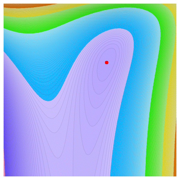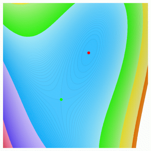 | We had a little discussion and I (Oliver) thought that one could get an example of a single local non-global extremum by taking a plane like z=x+y and carve a little "dip" into it to get a local extremum. The animation illustrates this with f(x,y) = x+y- c exp(-x2-y2) for various values of c. Other team members objected that this would not produce a counter example and indeed we always see a second saddle point. The idea does not work, In order to get an example as above, the saddle has to be moved to infinity. And Chen-Yu's example does this. |