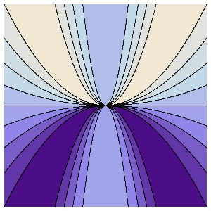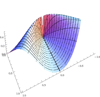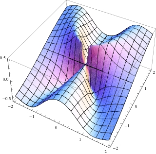 The contour map of f. Level curves of different values meet at the origin. The graph of f shows the mountain rist, y=x2 on which the limit is 1/2 On every line through the origin, f is continuous: the limit is 0.