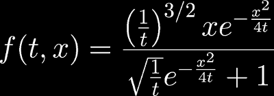 D[(x/t)*Sqrt[1/t]*Exp[-x^2/(4 t)]/(1+ Sqrt[1/t] Exp[-x^2/(4t)]),x]computes the derivative of the above function with respect to x. Entering (x/t)*Sqrt[1/t]*Exp[-x^2/(4 t)]/(1+ Sqrt[1/t] Exp[-x^2/(4t)])plots the function. Note that Mathematica can be a bit picky if you enter things in a different way. f[t_,x_]:=(x/t)*Sqrt[1/t]*Exp[-x^2/(4 t)]/(1+ Sqrt[1/t] Exp[-x^2/(4t)]);should define the function under consideration. |