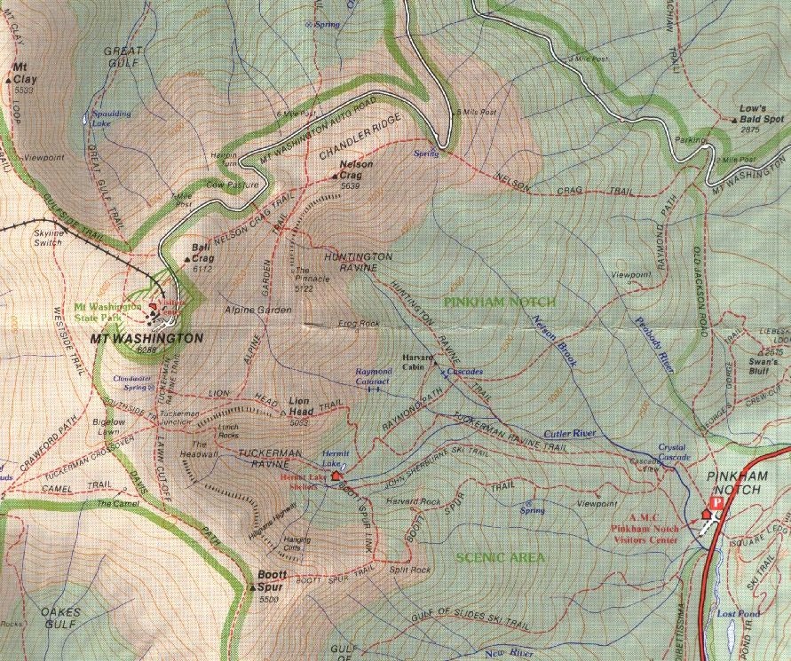 | Mt Washington is a 6288 feet high peak in the white mountains of New Hampshire and also known as the "home of the world's worst weather". If you look at the topographical map of the region, you notice that the rivers and brooks always cross the level curves perpendicularly. Water goes in the direction of the steepest decent. But there is an anomaly. If you follow from the Nelson Crag the Nelson Crag Trail, you follow the springs of a couple of brooks. Two of them do not follow the same pattern and cross the level curves in an angle which is not 90 degrees. Can you find the reason? (The reason is not mathematical. And it is not the fact that winds on Mt Washington can reach 231 miles per hour.) |