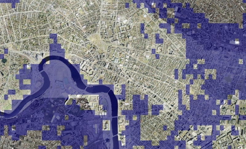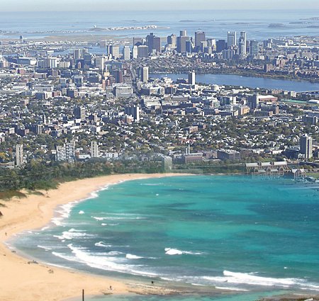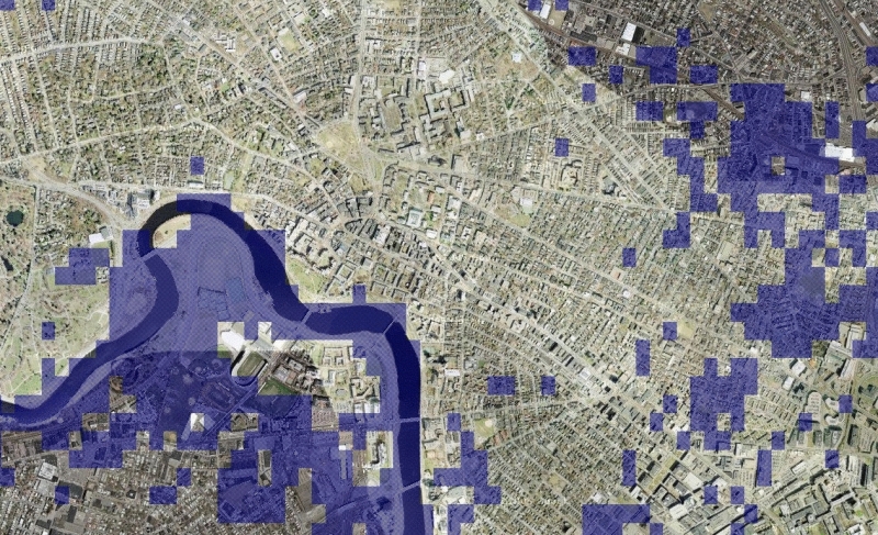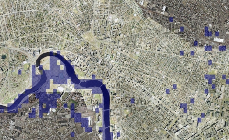 | This is how Harvard yard would look like with a sea level of 14 Meters. A google map extension allows to explore the world with higher sea levels: Charles river. Wouldn't it be nice to have a nice ocean beach right near Harvard yard? It would actually not be so nice. Much of Boston and Cambridge would be flooded. |