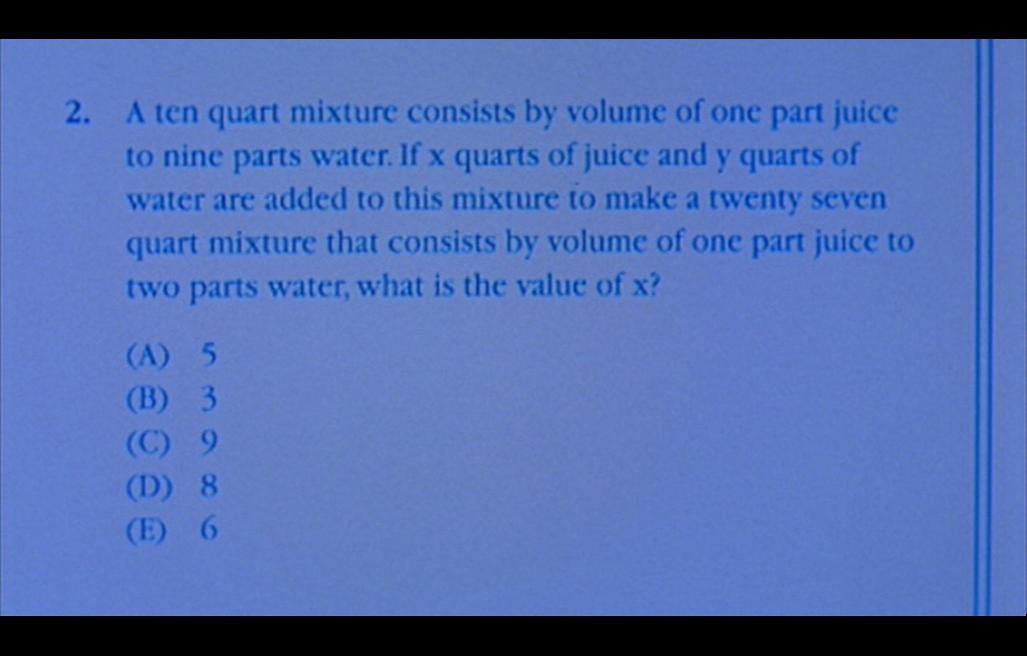 In the movie "Perfect Score" (Paramount 2004), the following SAT problem appears:
