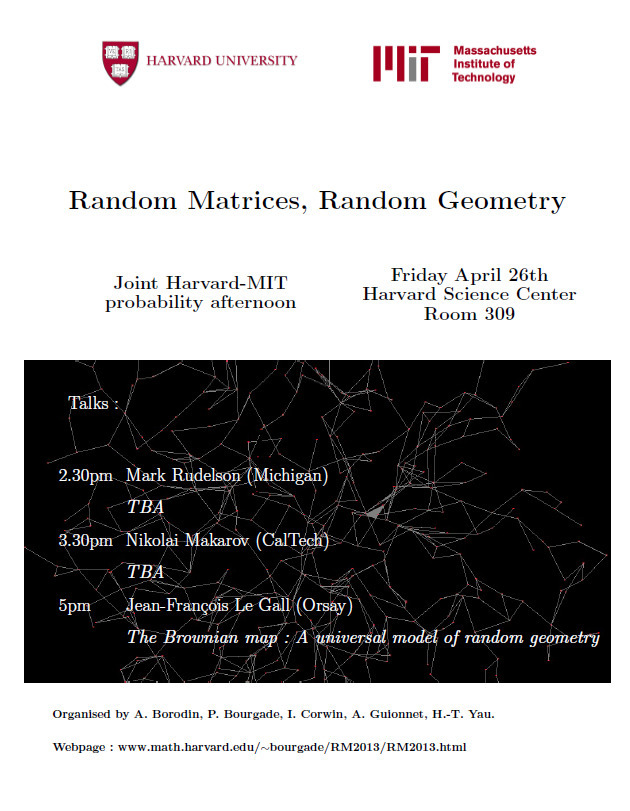 Organized by A. Borodin, P. Bourgade, I. Corwin, A. Gulonnet and H.T.Yau