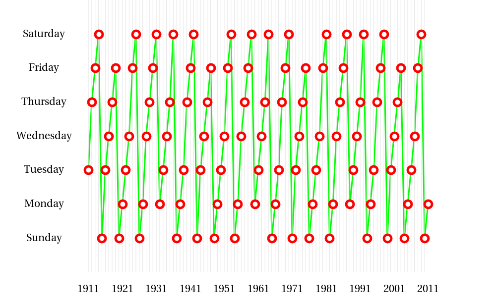 Piday in the last 101 years starting from 1911 and ending 2011. It took place