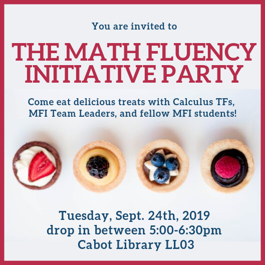 | Come eat delicious treats with Calculus TFs, MFI Team Leaders and fellow MFI students. Tuesday, September 24th 2019, drop in between 5 to 6:30 PM Cabot Library LL03. |