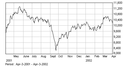 The values of financial instruments provide real-life examples of functions f(t) such that f'(t) never exists. These functions are best modeled instead as random processes. The graph of the Dow Jones Industrial Average is shown above. |