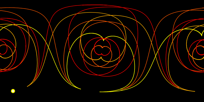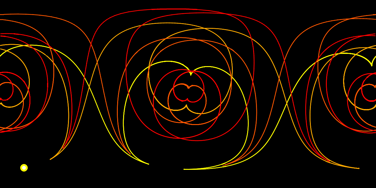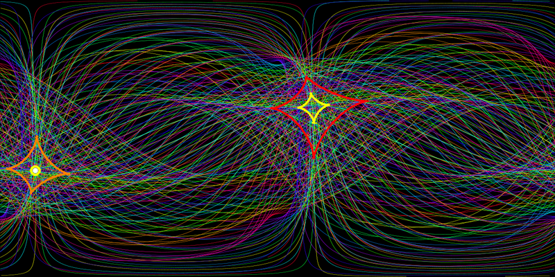 The primary caustic (the first root of the Jacobi field f starting at the initial point) is drawn in yellow,