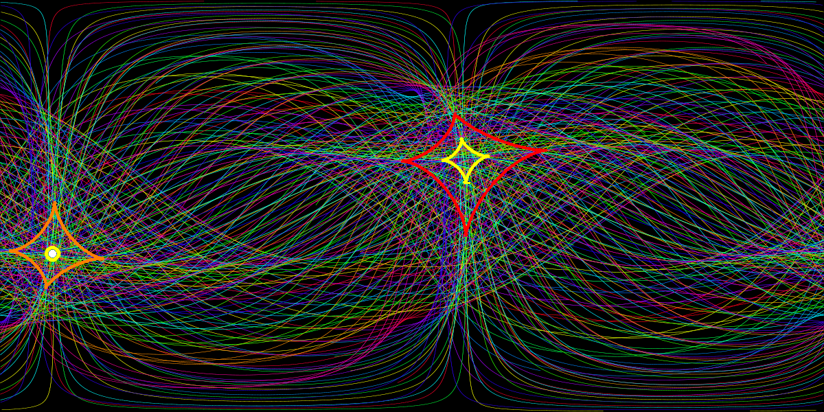 100 geodesics of the 6000 computed geodesics have been drawn. The picture was computed by solving the geodesic equations