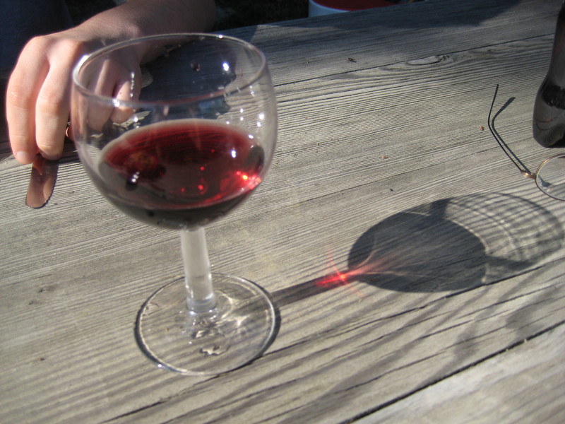 Caustic from wine glass. Photo: 2009, Oliver Knill. One can see caustics on the glass stem as well as on the table.