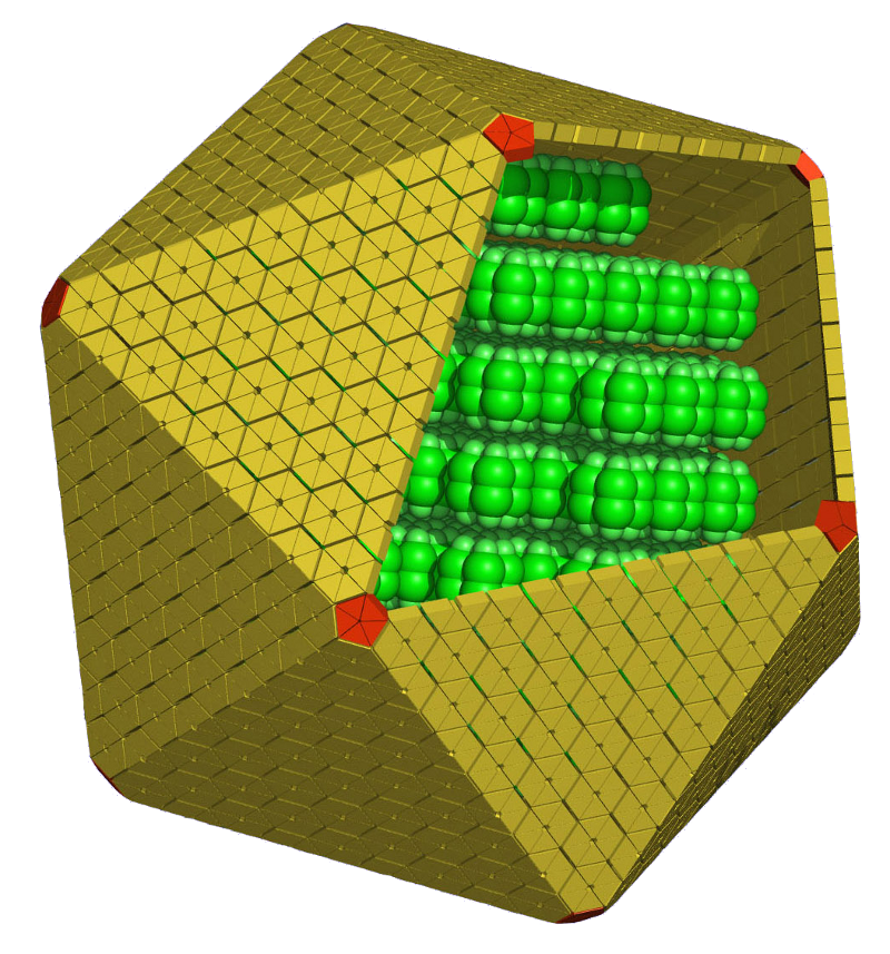 Carboxysomes are compartments found in some bacteria. They contain enzymes used to fixate carbon dioxide. Their protein shells often have icosahedraal shape. Wikipedia entry. The K1 curvature for these polyhedra is 12, the K2 curvature is 60.
