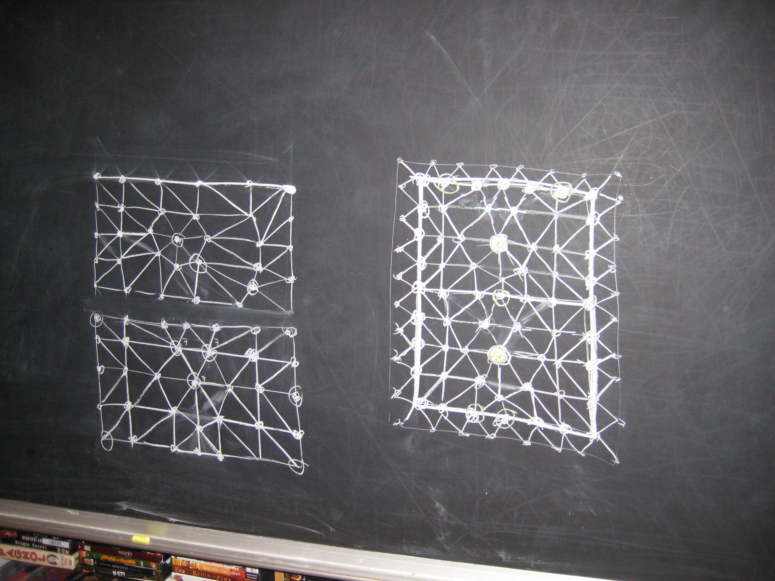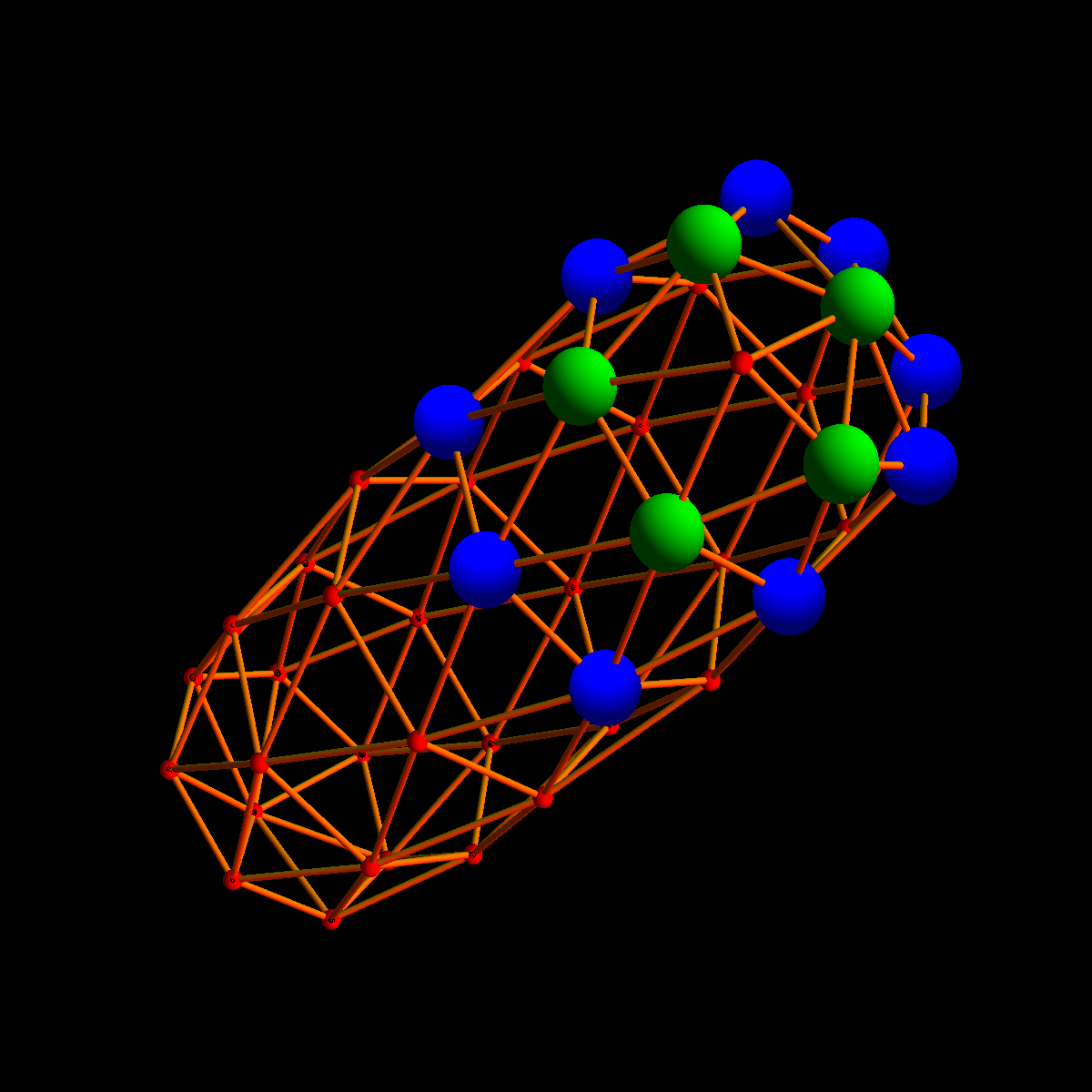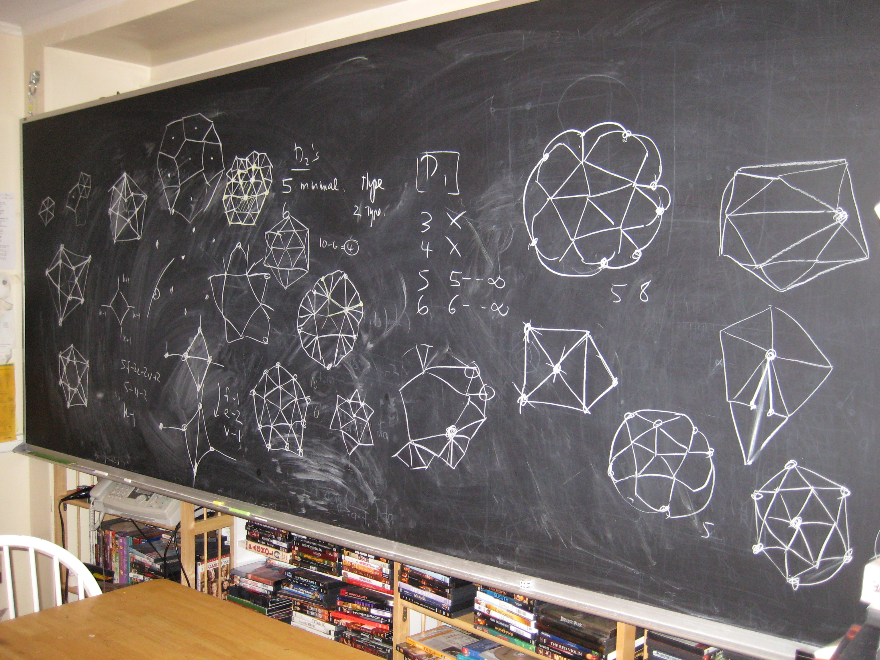 Here is an example for which the total curvature K(x) = 2 |S1| - |S2| is equal to 60. Like for the icosahedron, where each point has curvature 5 and 12*5=60, the curvature 60 theorem holds for all fullerene or two dimensional graphs for which the degree is 5 or 6. Since most graphs I had build with geomags had curvature 60, I had hoped in Spring 2009 that a curvature 60 would hold. 2 years later, I still do not know exact conditions which make a curvature 60 theorem work. A two dimensional SMOOTH graph has curvature 60. What is condition SMOOTH My paper on flat regions shows that it might be subtle. We certainly need that spheres S1(p) and S2(p) are cyclic one dimensional graphs at each point. Its easy to see that this implies that each point has degree larger than 4. I know that XXX= "the combinatorial curvatures K1(p) = 6-|S1(p)|" are all nonnegative" works but this is rather weak because such graphs are either flat tori with zero curvature or then the Euler characteristic is 2. (By the combinatorial Gauss Bonnet, the sum of the combinatorial curvatures is 6 times the Euler characteristic so that for Euler characteristic is negative, there are points with negative curvature).