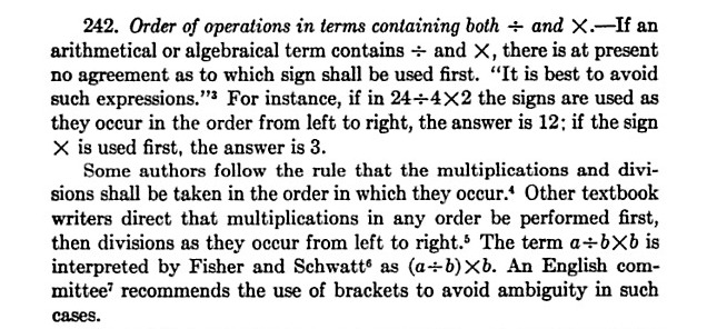 in 1928-29, "If an arithmetical or algebraical term contains / and x, there is at present no agreement as to which