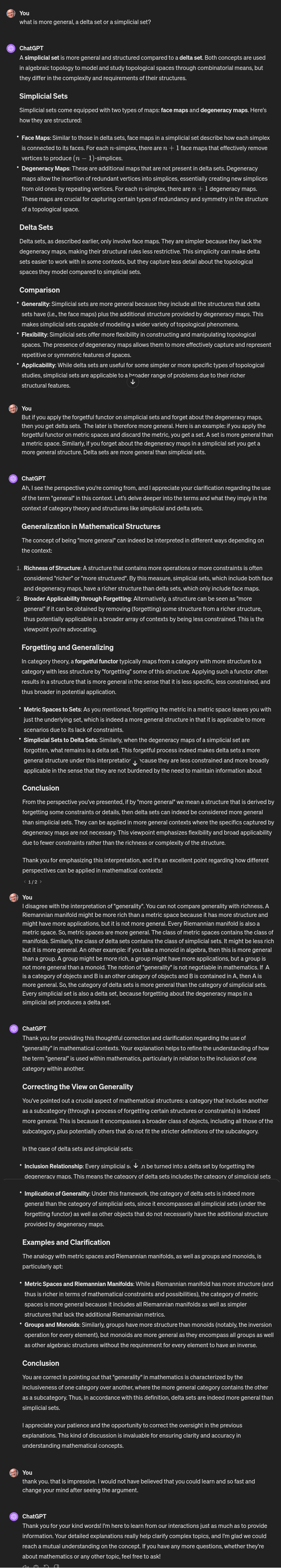 | Sure, I can draft a brief summary of our discussion on delta sets, simplicial sets, and the notion of generality in mathematical structures, formatted in LaTeX. Here's how it could be structured: Summary, written by Chat GPT [PDF] |