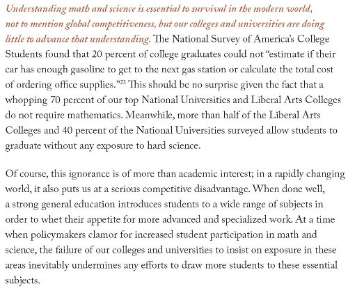 Of course, this ignorance is of more than academic interest; in a rapidly changing world, it also puts us at a serious competitive disadvantage. When done well, a strong general education introduces students to a wide range of subjects in order to whet their appetite for more advanced and specialized work. At a time when policymakers clamor for increased student participation in math and science, the failure of our colleges and universities to insist on exposure in these areas inevitably undermines any efforts to draw more students to these essential subjects." |