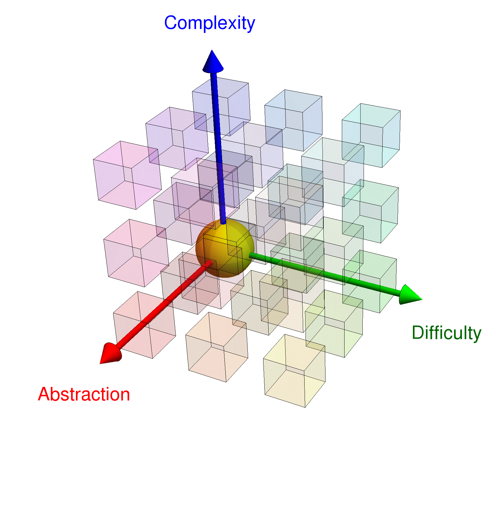 | The Abstraction-Difficulty-Complexity parameter space is a three dimensional space which allows to assess a topic, a course or an assignment. See this document on problem types [PDF] or this these notes while working with Paul Hermany on a project in taxonomy [PDF]. Homework problems, exam problems or problems used in lecture are usually taken from different parts of this space. In a lecture, we can be a bit more abstract, a homework question can be a bit more difficult or complex, exam problems however should have low complexity and be of moderate abstraction and difficulty. The Difficulty and the Complexity level is usually relatively easy to assess. The complexity is essentially the amount of effort needed to finish the task, the difficulty is the amount of new ideas are needed to solve a problem. The abstraction which measures how far the situation is from daily life. General structures are in general abstract, while concrete applications are usually less abstract. The question how abstract something is perceived can be more tricky and harder to assess. The reason is that the notion of abstraction depends on the pre-knowledge level. For somebody who knows a lot of mathematics already, it is easy to grasp the relatively abstract concept of category theory. However, as there are so many , (the nLab website has currently 13559 pages), things can also get difficult due to the vast amount of information. |
