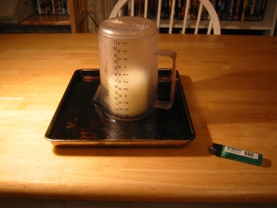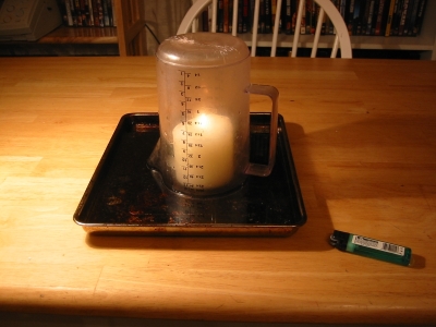 I'm helping a grandchild with a science experiment. It's similar to your experiment above, however, we taped a 300cc oxygen absorber to the inside "top" of the pitcher. We were told as the chemical reaction takes place inside the packet (rust/oxidation) the oxygen inside the pitcher is absorbed into the packet creating a void (vacuum). The water below is drawn in to fill the void. The oxygen absorber does heat up during the process of oxidation. Would this be the same effect as the candle? Is the absorber packet really absorbing oxygen or converting it? Your thoughts are appreciated. Thanks- PhilMy answer: Hi Phil, oxygen absorbers produce rust from iron and oxygen which simplifies the situation because rust is not a gas and the chemical gas equations do not have to considered. So, one expects the water level to rise to the same amount as oxygen has been removed. The change of volume of the oxygen absorber can certainly be neglected I don't know how hot these absorbers get but I do not expect this to matter much. They probably absorb very slowly. It might initially push back the effect of depletion of oxygen but only little. I also do not know how much of the oxygen these absorbers are able to remove. Already in Lavoisier's case, the depletion of oxygen was not enough to suffocate a mouse so that also in the oxygen absorber case, only a fraction of the oxygen is removed. I have not made the experiment you describe but would estimate that the water level rises only little. Oliver |